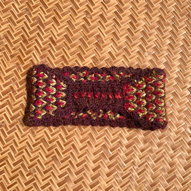 ひし形模様のヘアバンド ボルドー × ピンク ※着用画像は、色違いを着けています。 立体的なひし形模様立体的なひし形模様のかぎ針編みのへアバンドです。 ブラウン系の糸はキッドモヘヤ&ウールのかすり染めとメリノウールを甘く撚糸しているので、一様でない色の見え方が奥行きのある色感を感じさせてくれます。 それにピンク&オレンジの糸とイエロー&オリーブ系の糸で構成した、まるで宝箱に眠っているような落ち着いた豪華さのある色調です。 全体の色味の奥行きがあり、さまざまな髪の毛の色に合わせてほしい配色です。 黒髪にも、明るめの髪の色にもなじんでくれそうです。 グレーヘアにはもコントラストの効いた装いにコーディネートにぴったりです。 遊び心たっぷりのヘアバンド、是非、気軽に普段使いに。 【デザイン】 ・3色の毛糸でひし形状の模様にクロシェ手編みで仕上げています。 ・細巾部分も伸縮性のあるかぎ針編みを利用してゴム無しでも頭にフィットしやすくなっています。 【素材】 ウール100% (モヘヤ含む) ウール素材は、ちょっと汗をかいても発汗性がよく、蒸れにくくてお勧めです。 おでこの汗も気にせずお使いいただけます。 汚れが気になったら、下記のお手入れ方法で洗ってあげてください。 【サイズ】 平置きでの上がり寸:約48cm (一周) 巾: 約10.5㎝ /5.0cm 対応頭囲サイズ:56~58cm ※引っ張って最大62cmくらいに伸びます。 【お手入れ方法】 ・単独手洗い(軽く押し洗い) ・中性洗剤使用 ・脱水時は洗濯ネットに入れると編地を傷めず安心です ・脱水後はすみやかに日陰で平干し ・乾燥機は避けてください 【注意点】 ・素材の特性上、引っ掛かりにご注意ください。 ・連日着用せず、伸びっぱなしになるのを避けるため、編地を休めながらの着用がおすすめです。