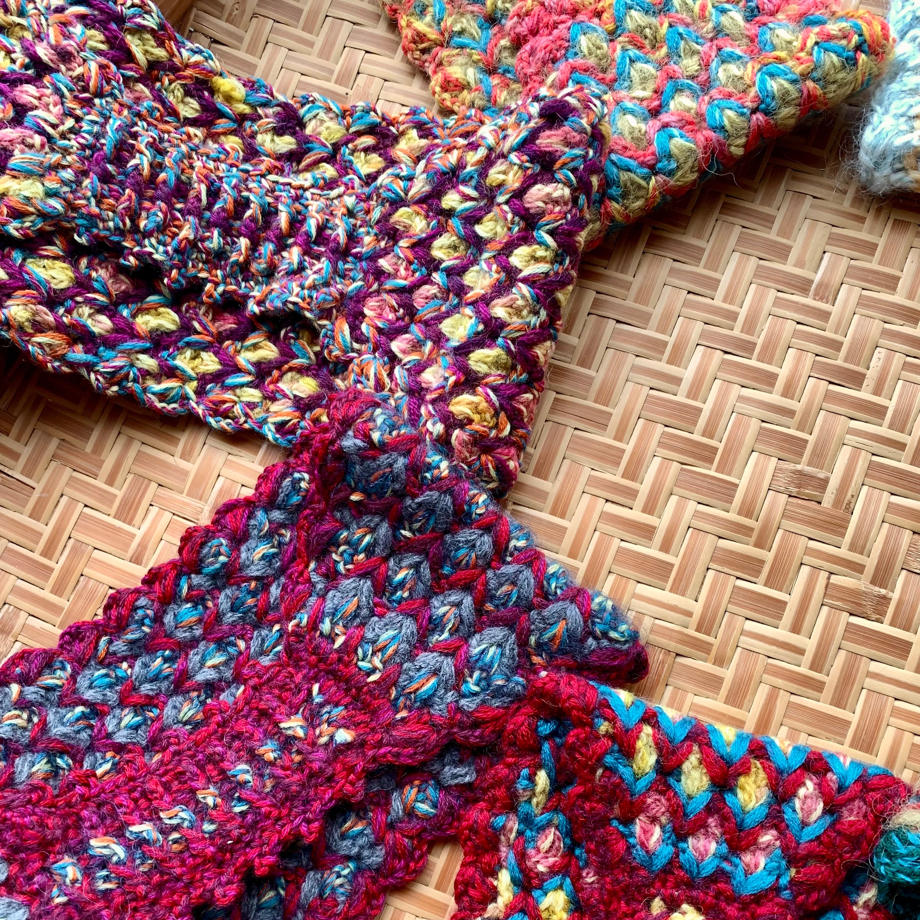 ・3色の毛糸でひし形状の模様にクロシェ手編みで仕上げています。