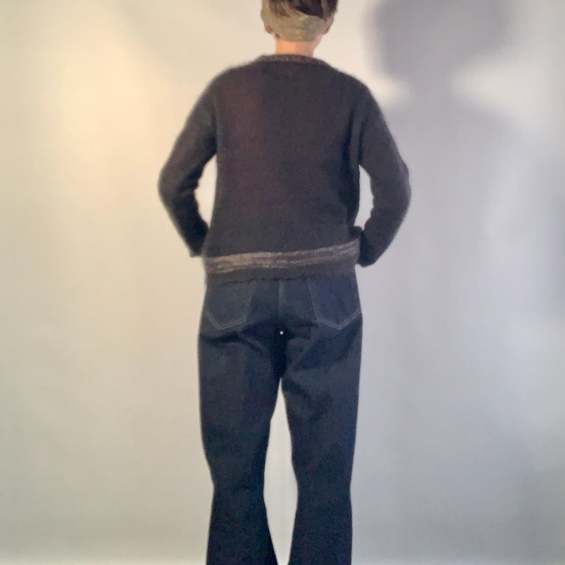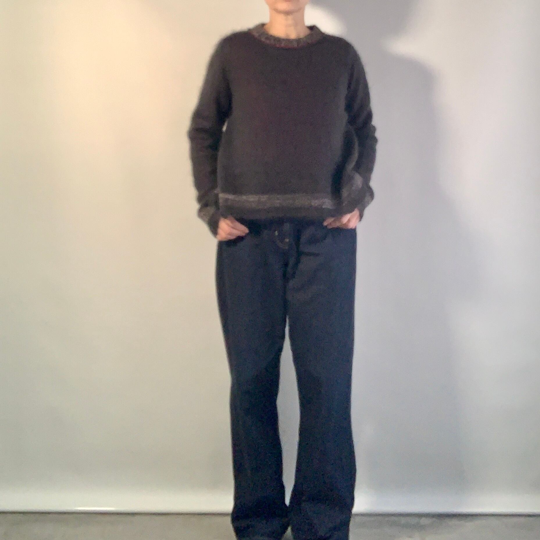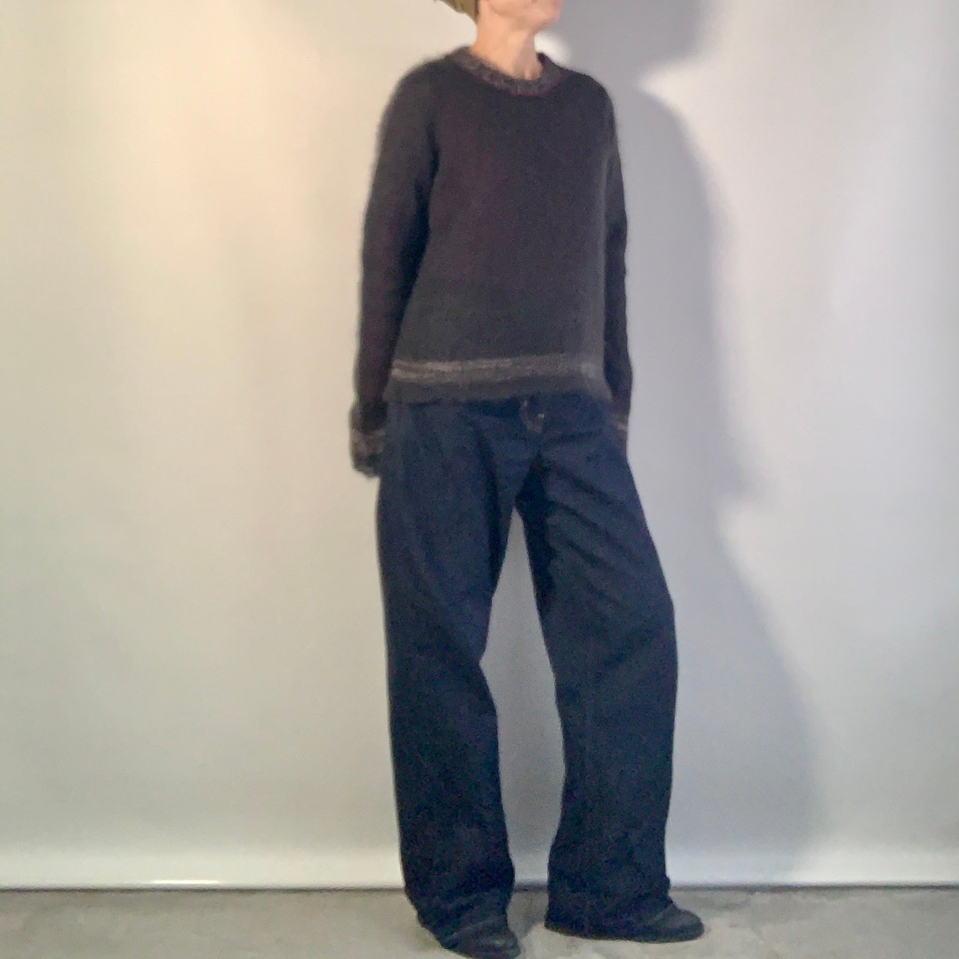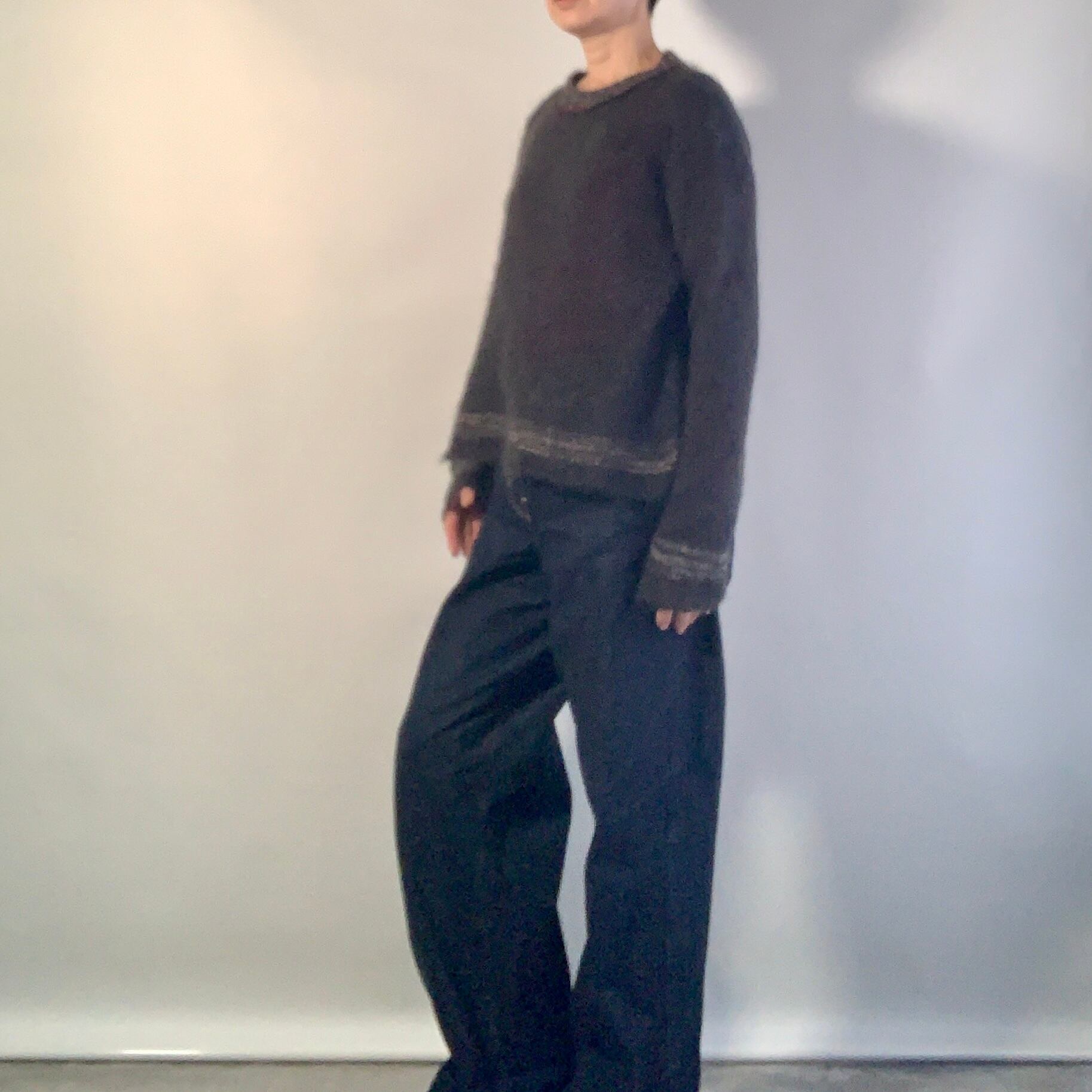 キッドモヘヤ+ウールの糸1本で軽く編み上げた、渋いチャコール(墨黒色)のニットトップ。