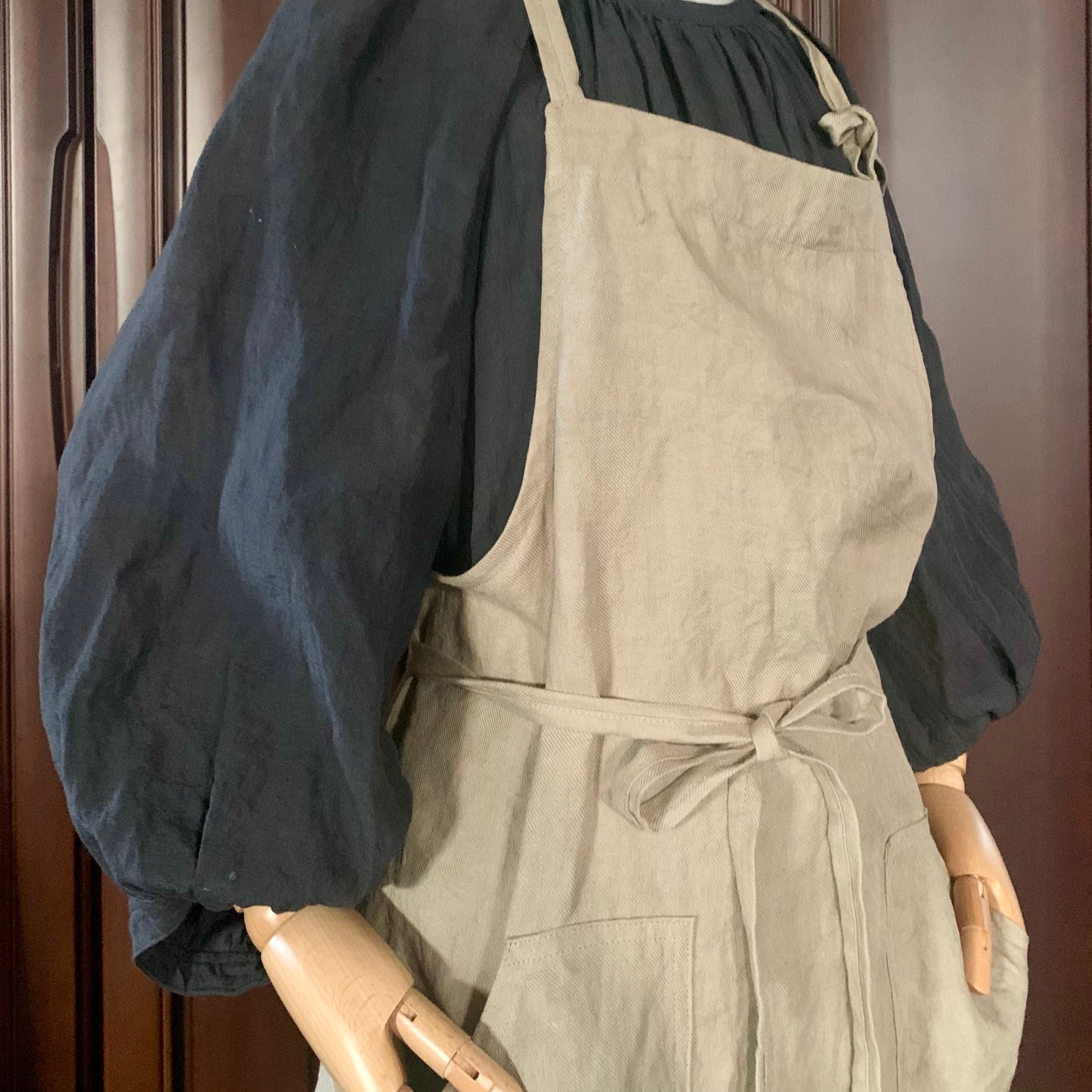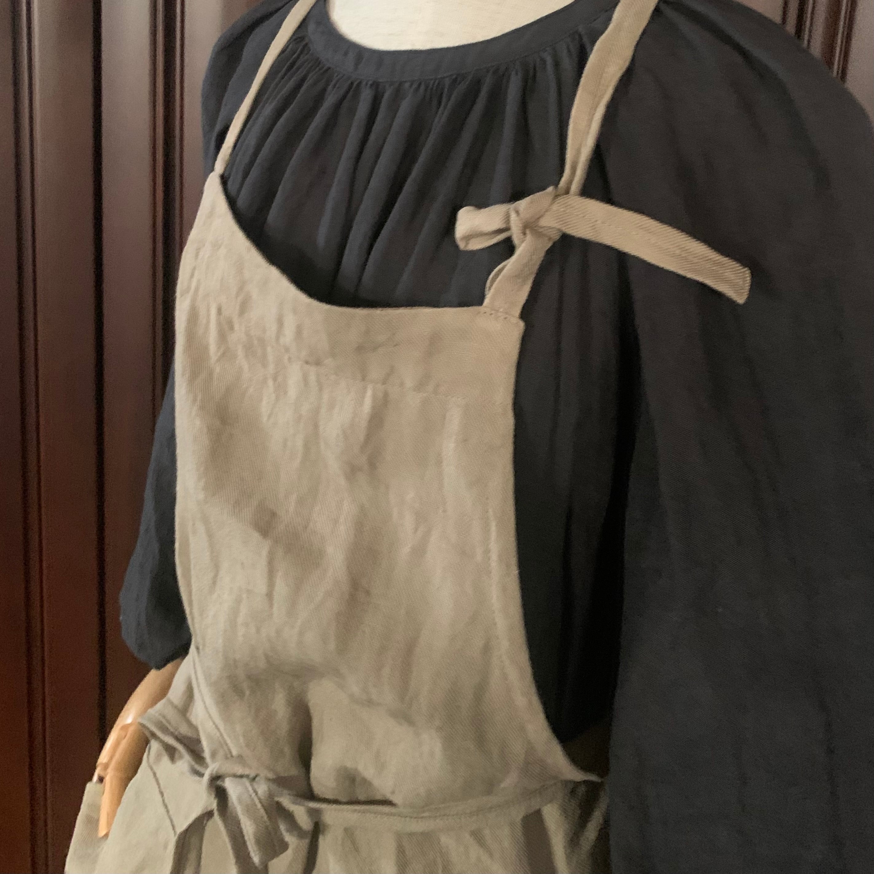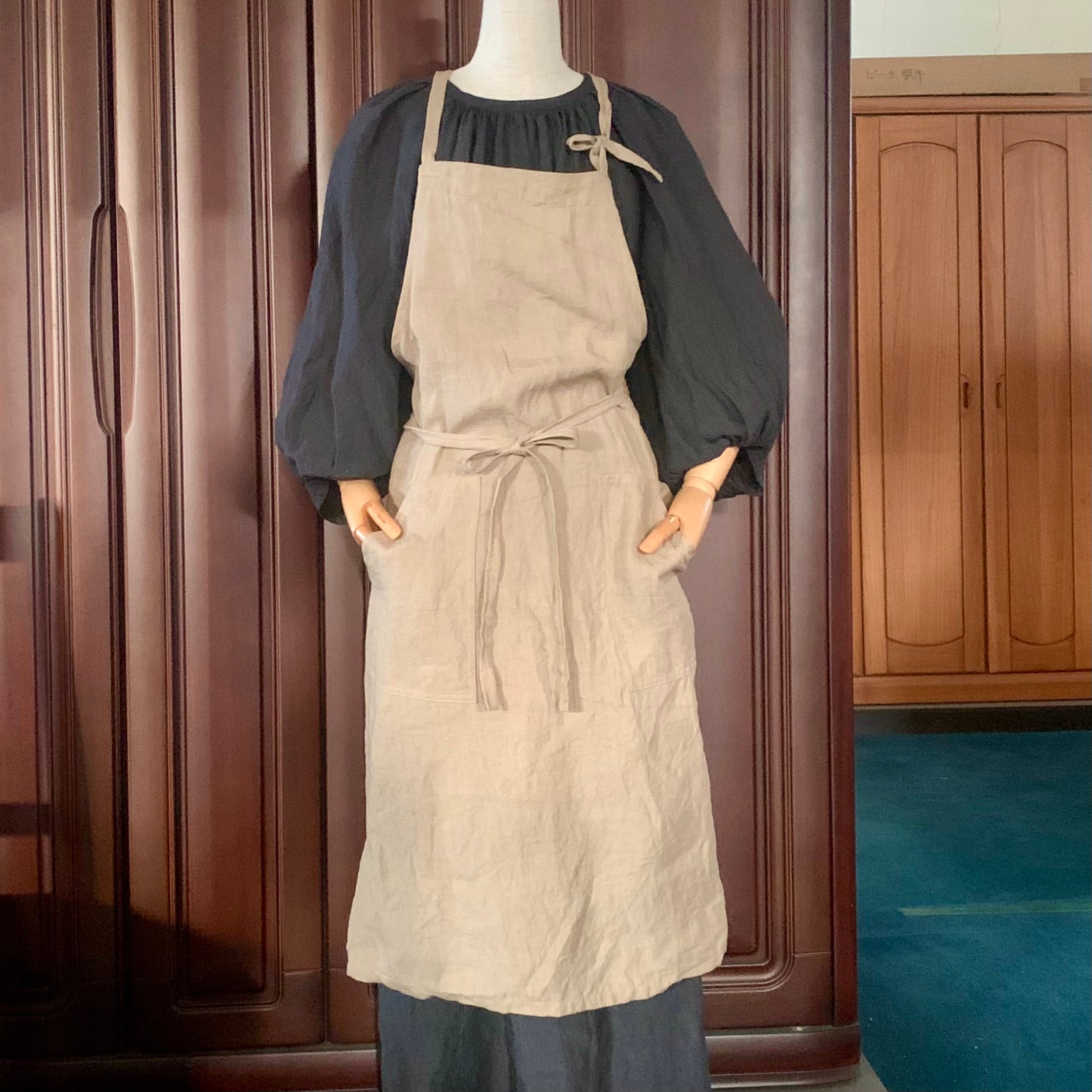 ・リネンツイル素材を生かした膝下丈のウエストひもを巻き付けて前で結ぶデザインです。