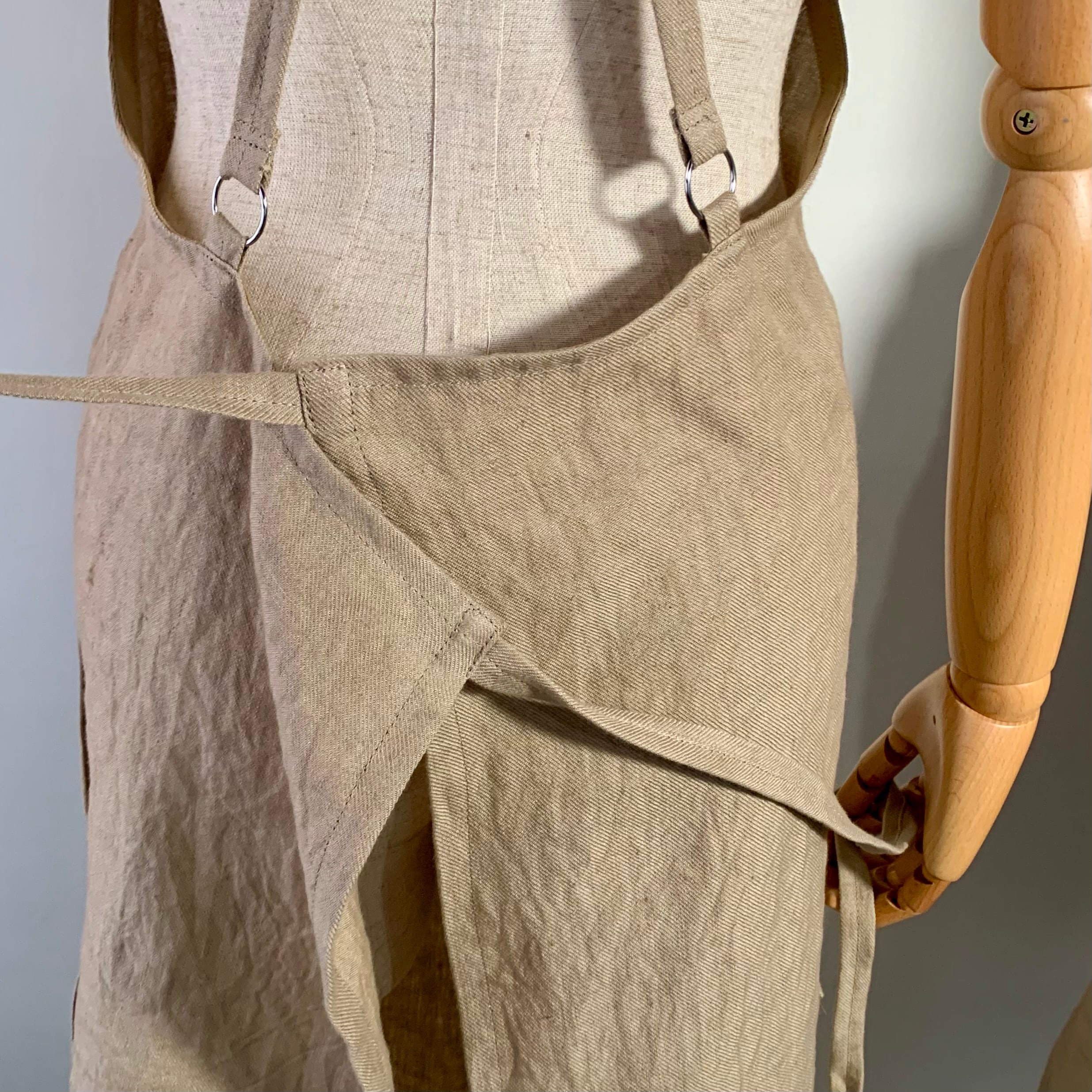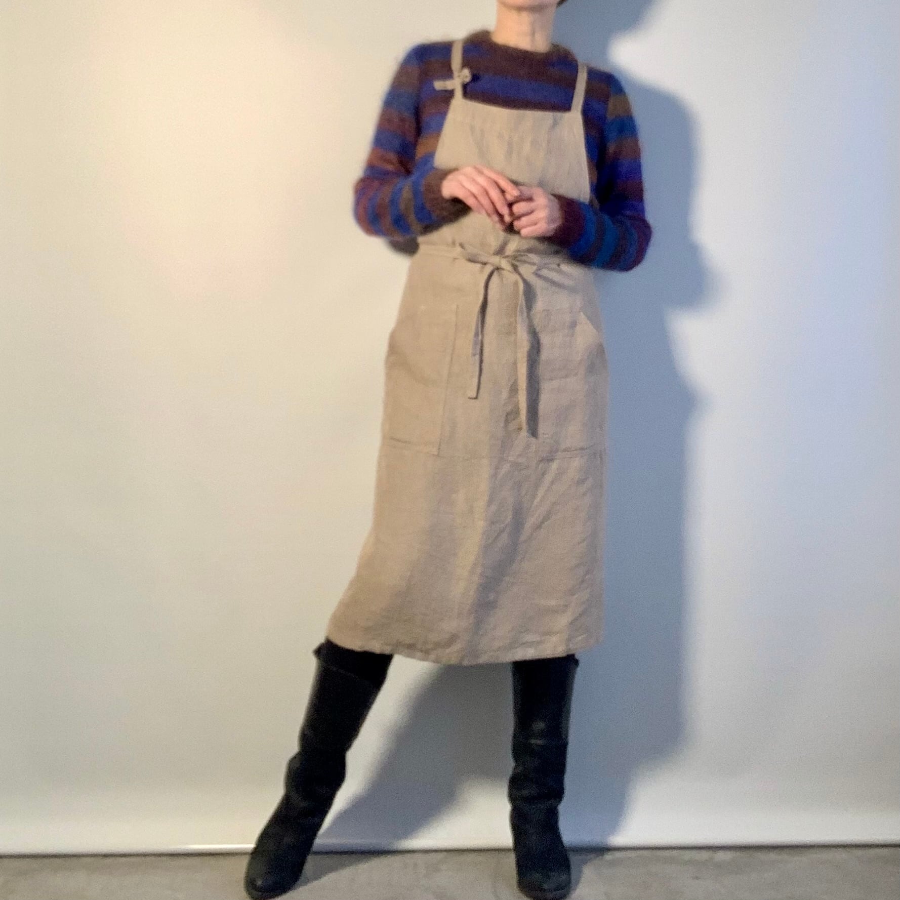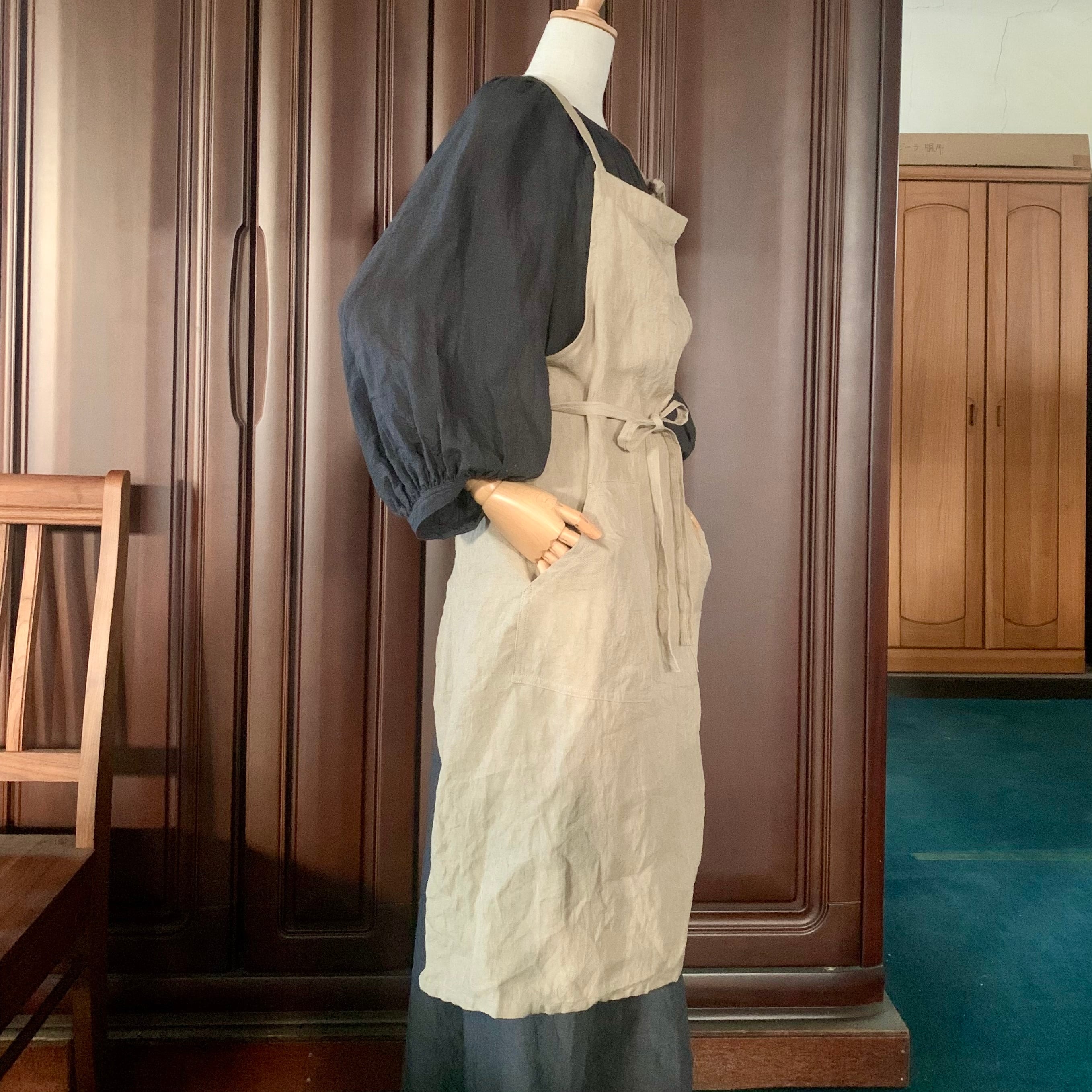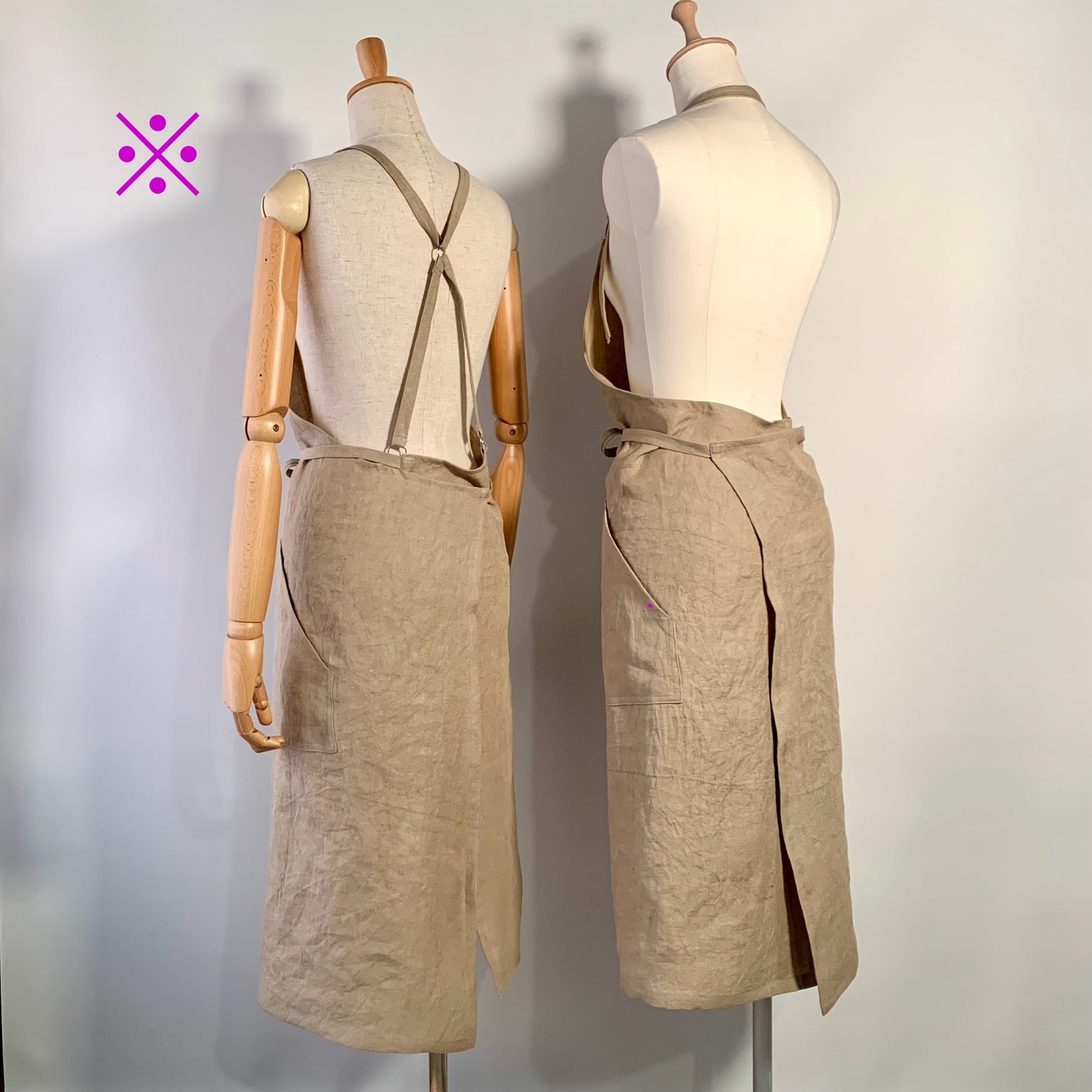 ・リネンツイル素材を生かした膝下丈のウエストひもを巻き付けて前で結ぶデザインです。