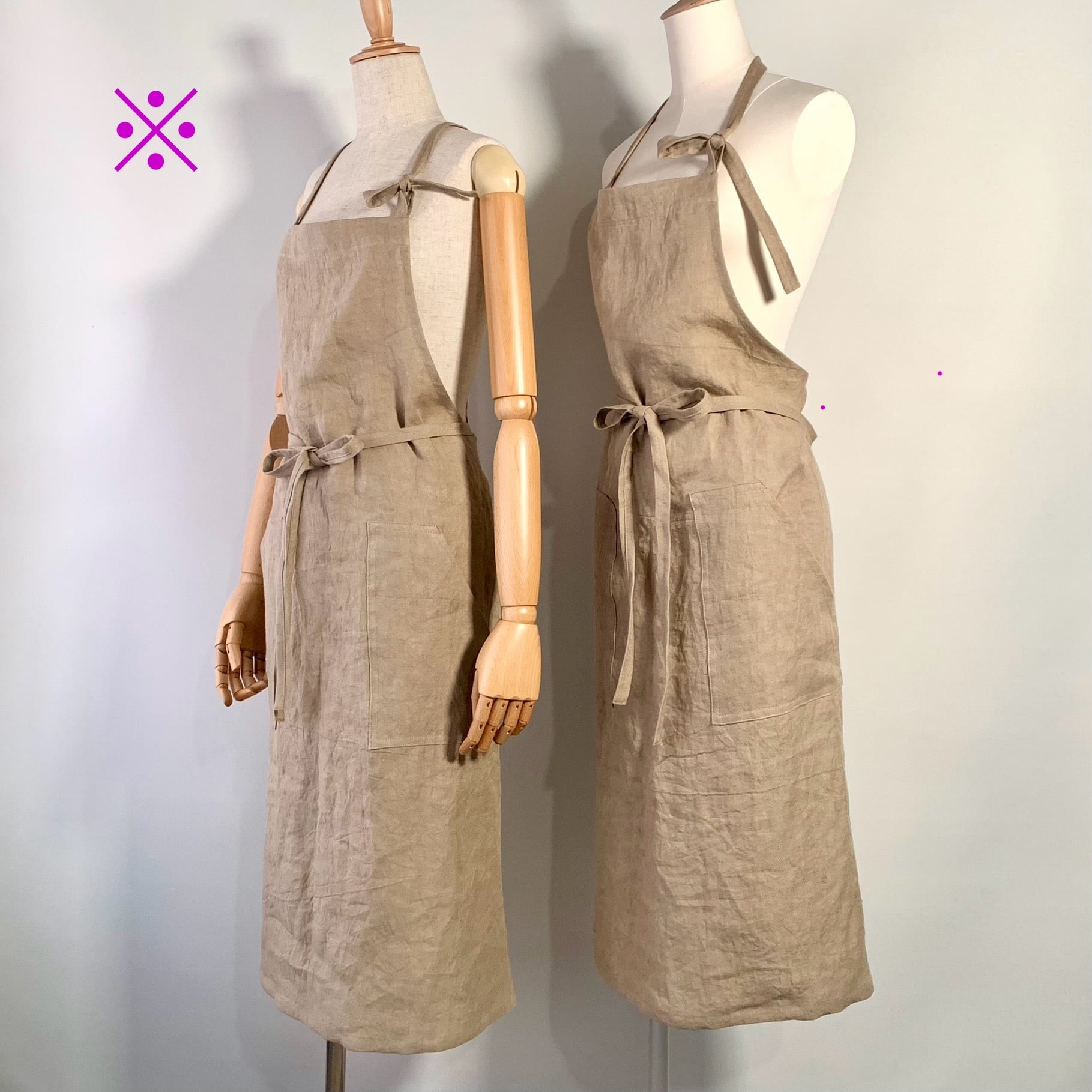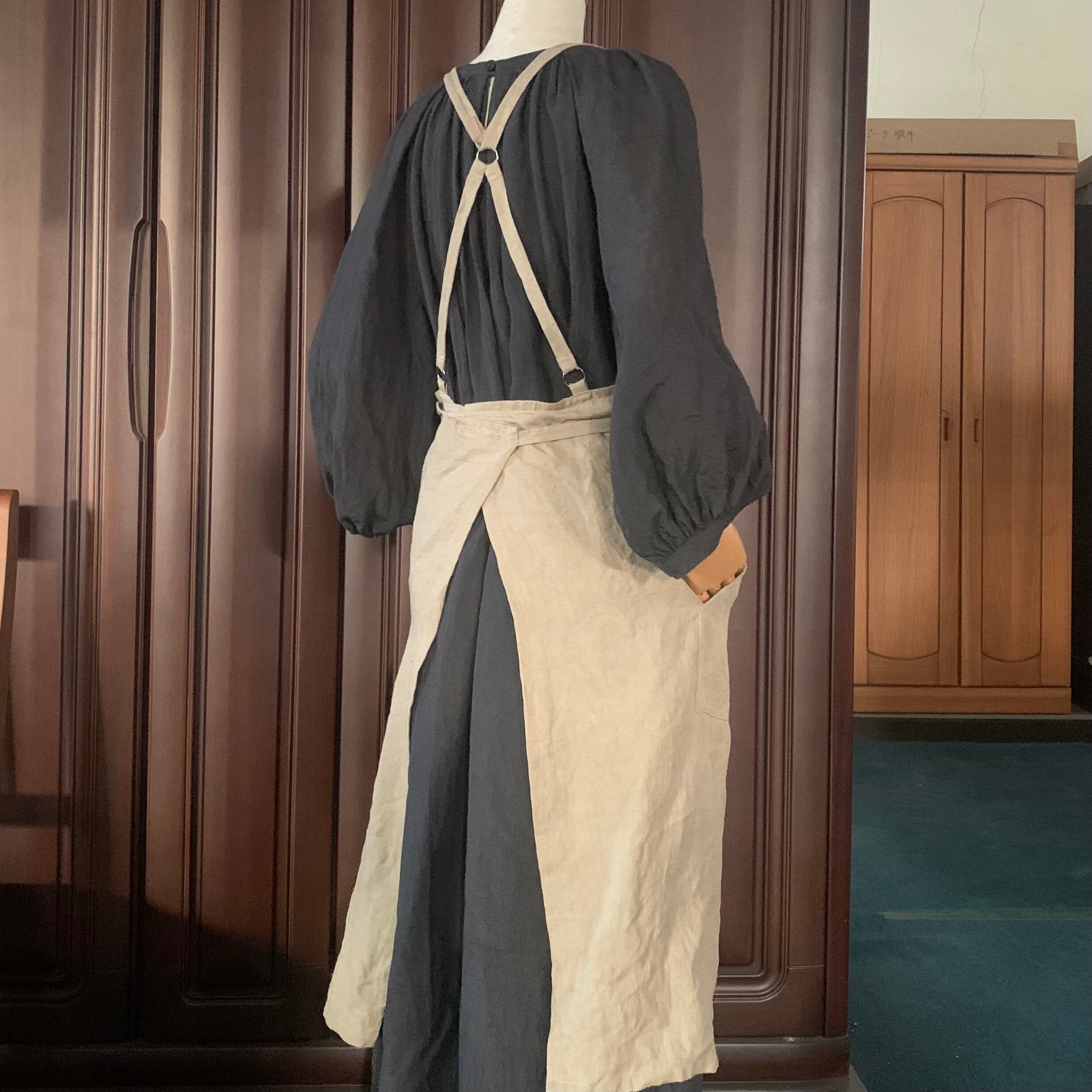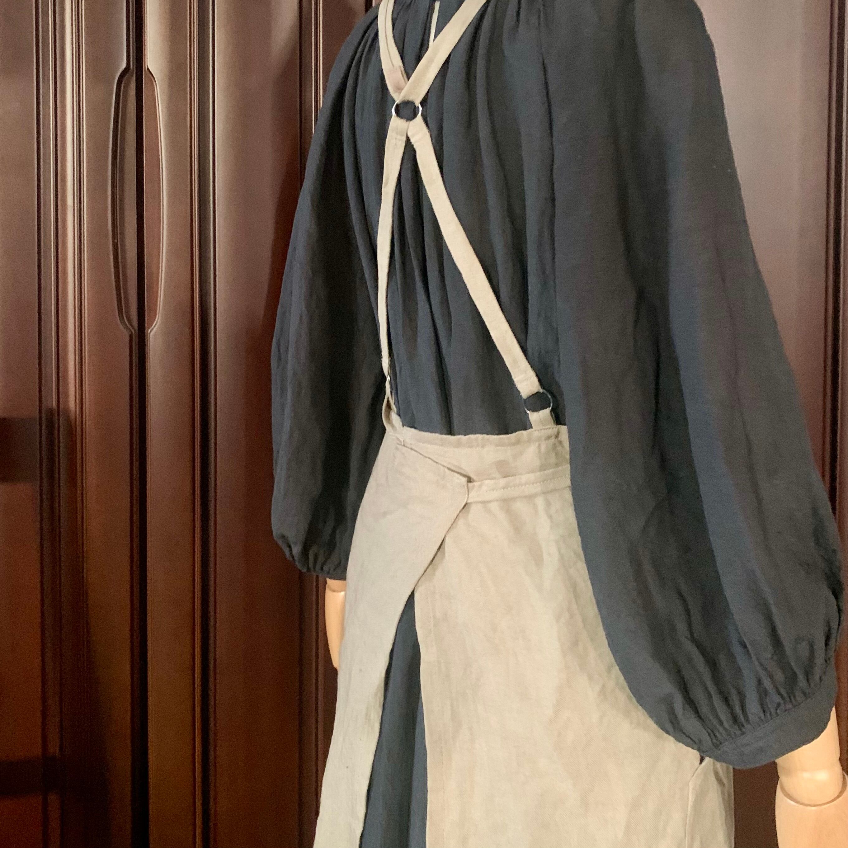 肩ひもを背面でリングに掛けるタイプのエプロン。