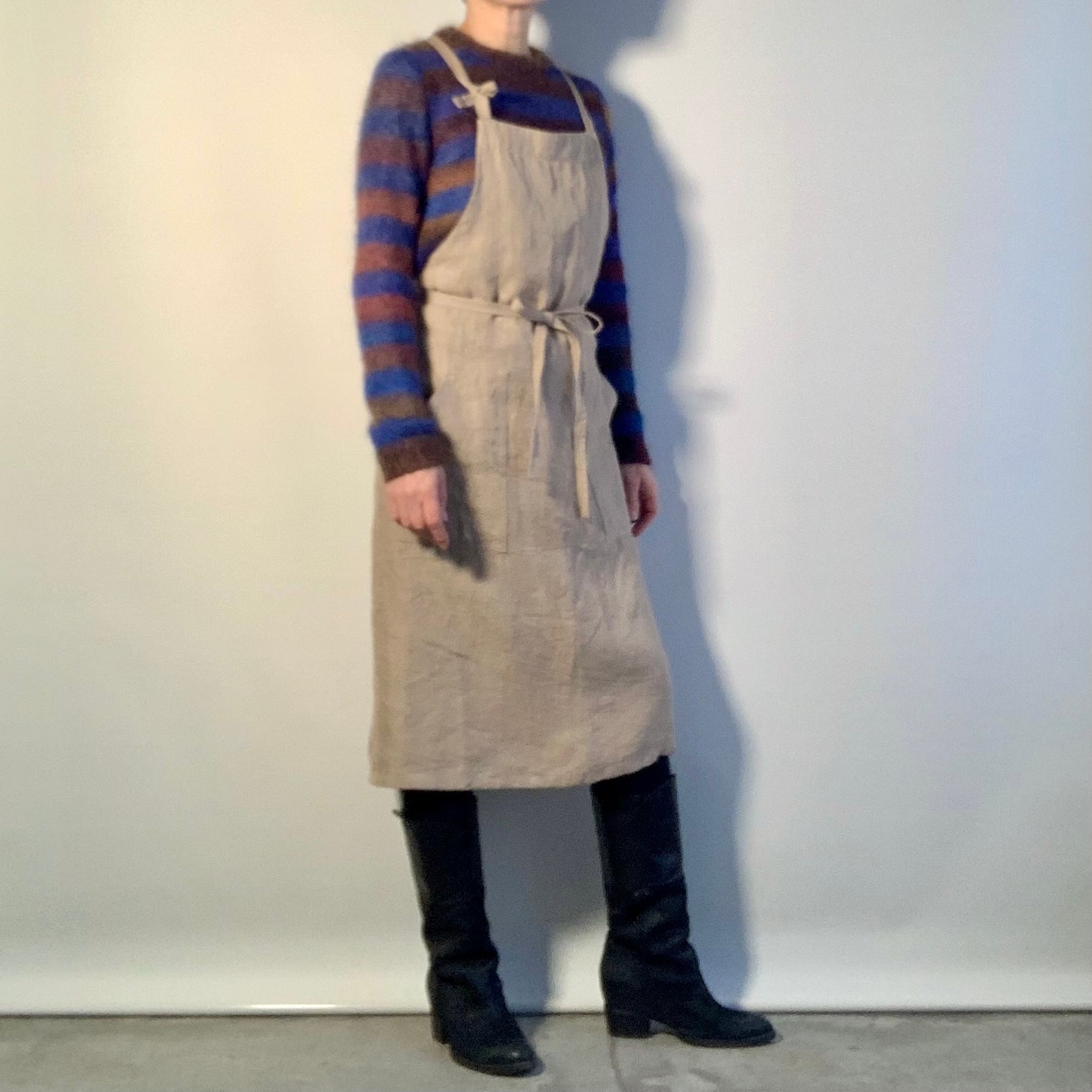 腰のあたりで低めにカッコよく結んでもいいし、ドレスの上からはウエスト位置で結んでホームパーティなどにもお勧めです。