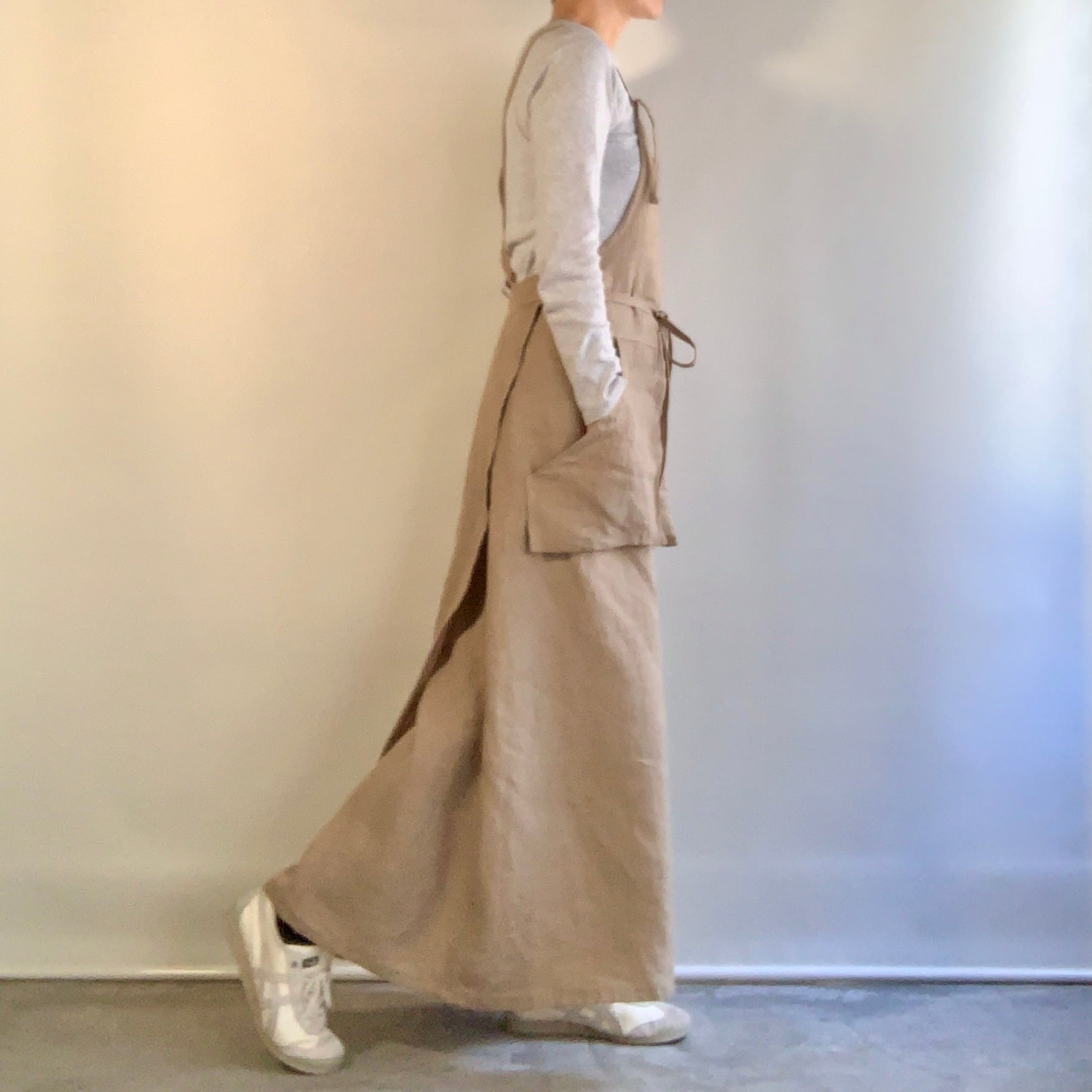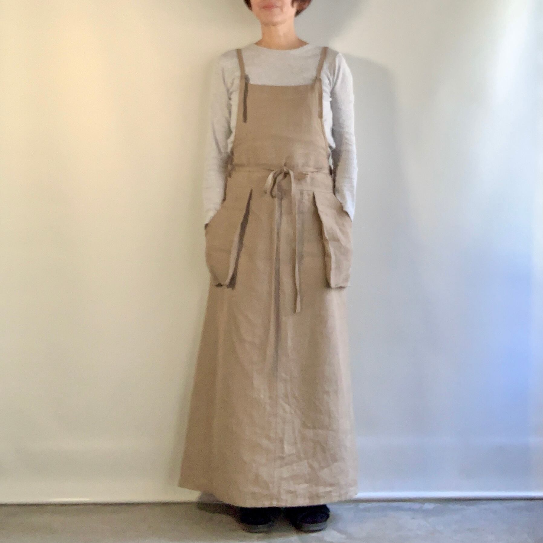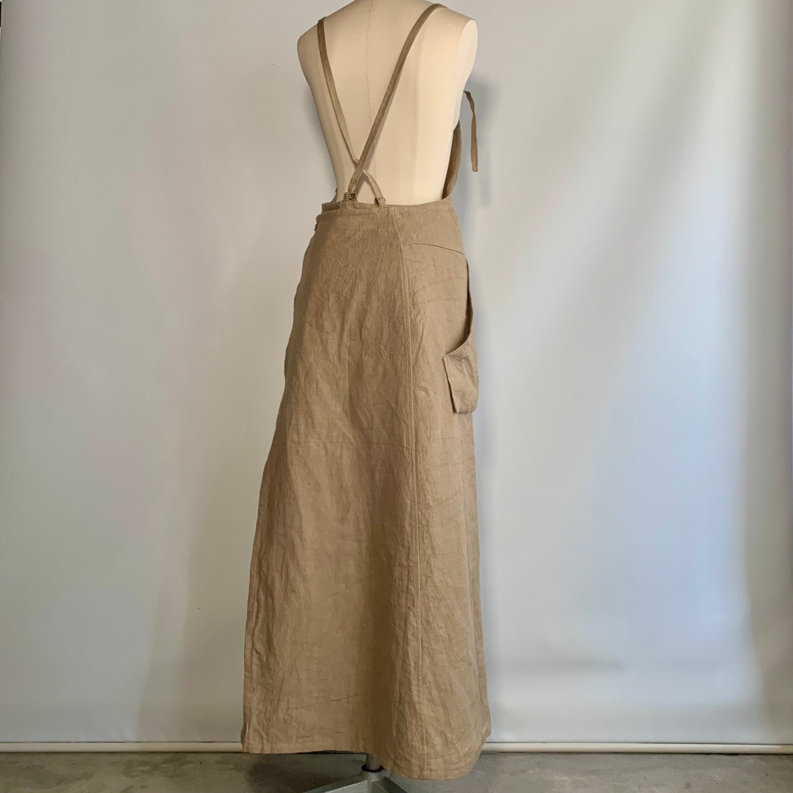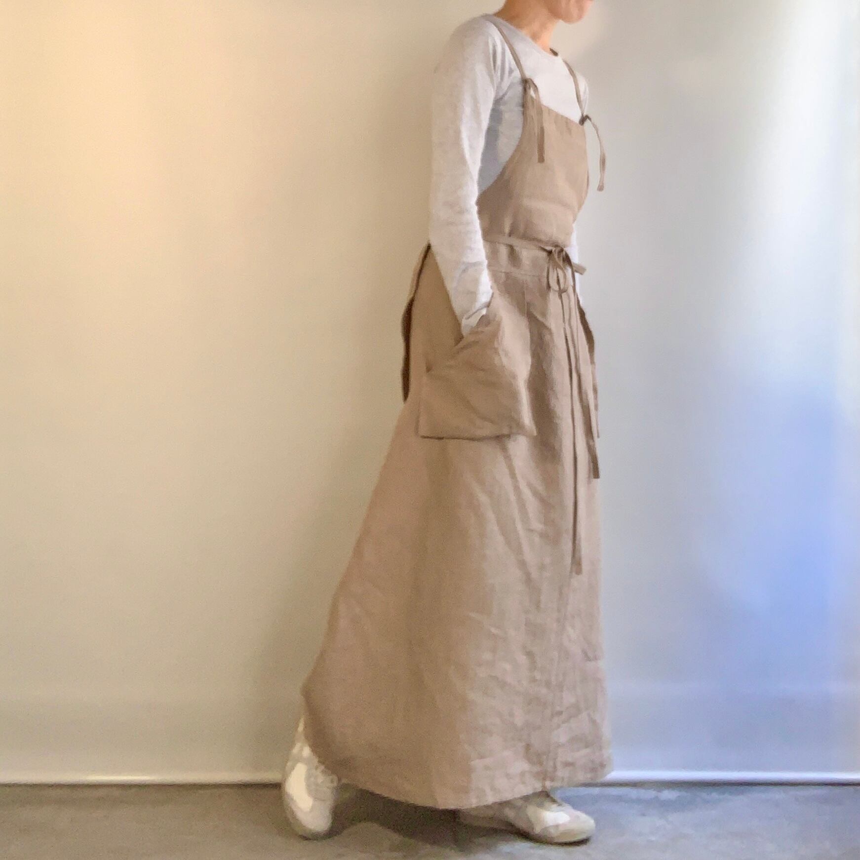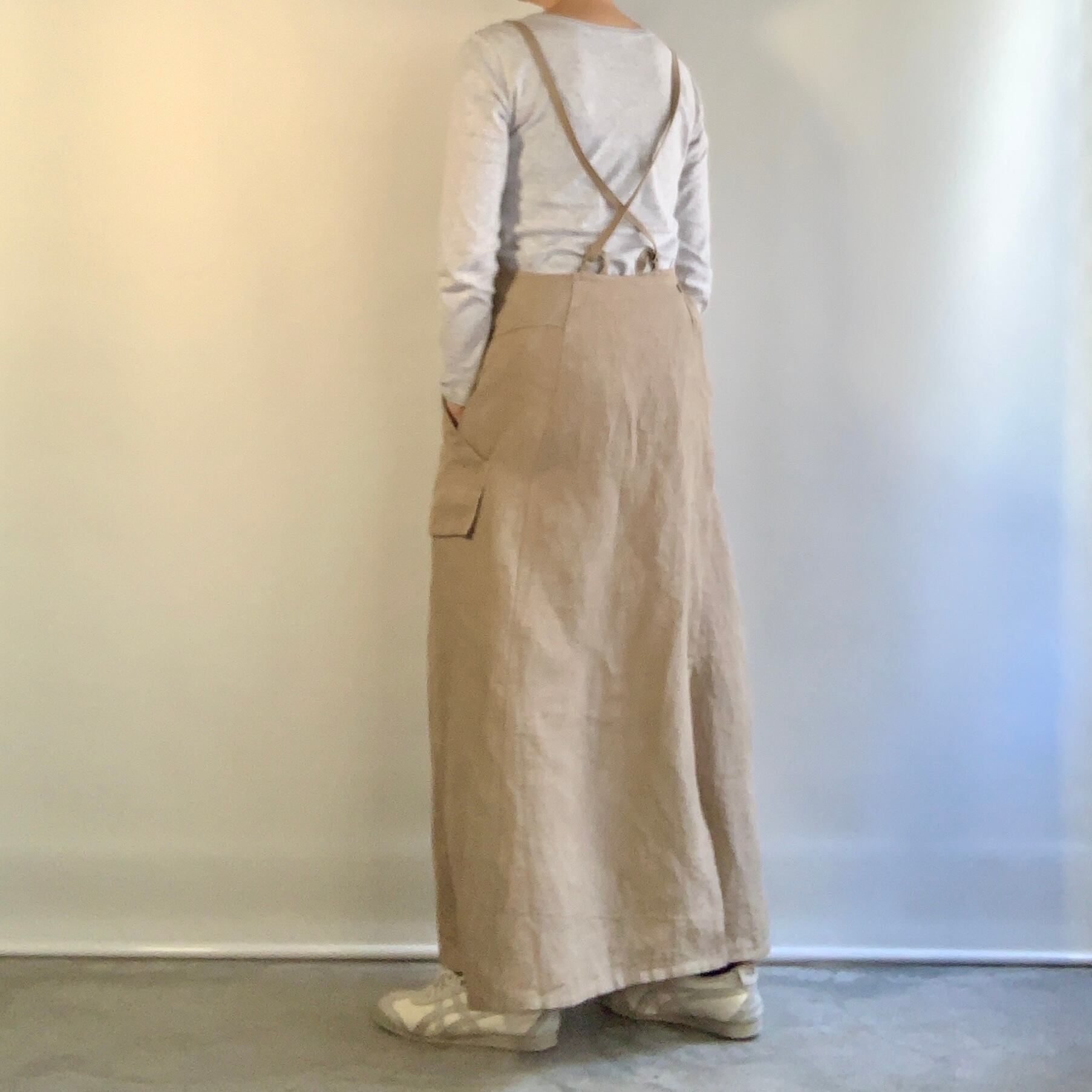 リネン100% 肩ひも2⁻wayのロング丈のサロペットドレスです。