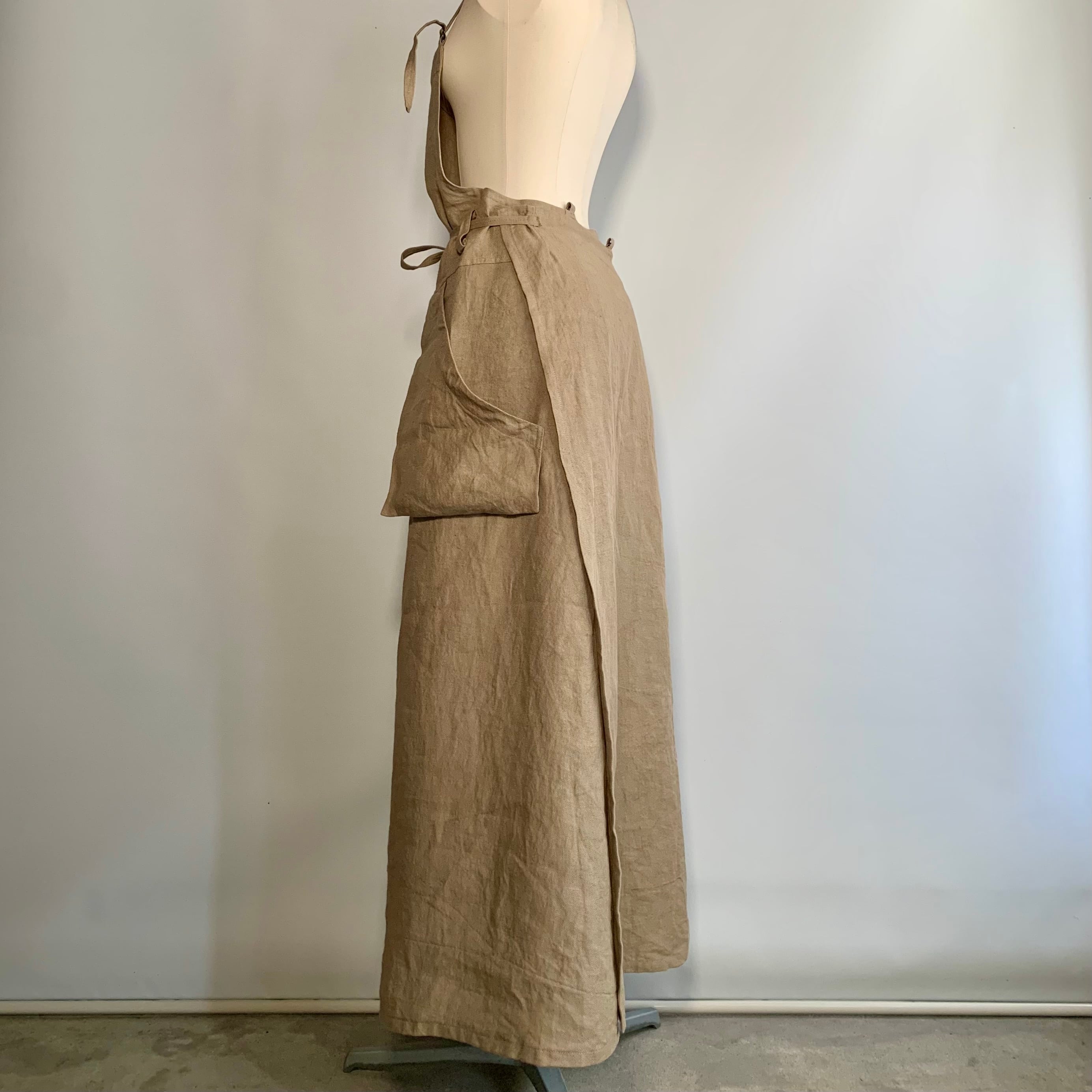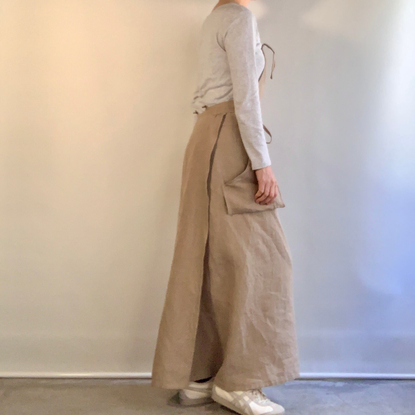 ・リネンツイル素材を生かしたロング丈ラップ式サロペットドレス。