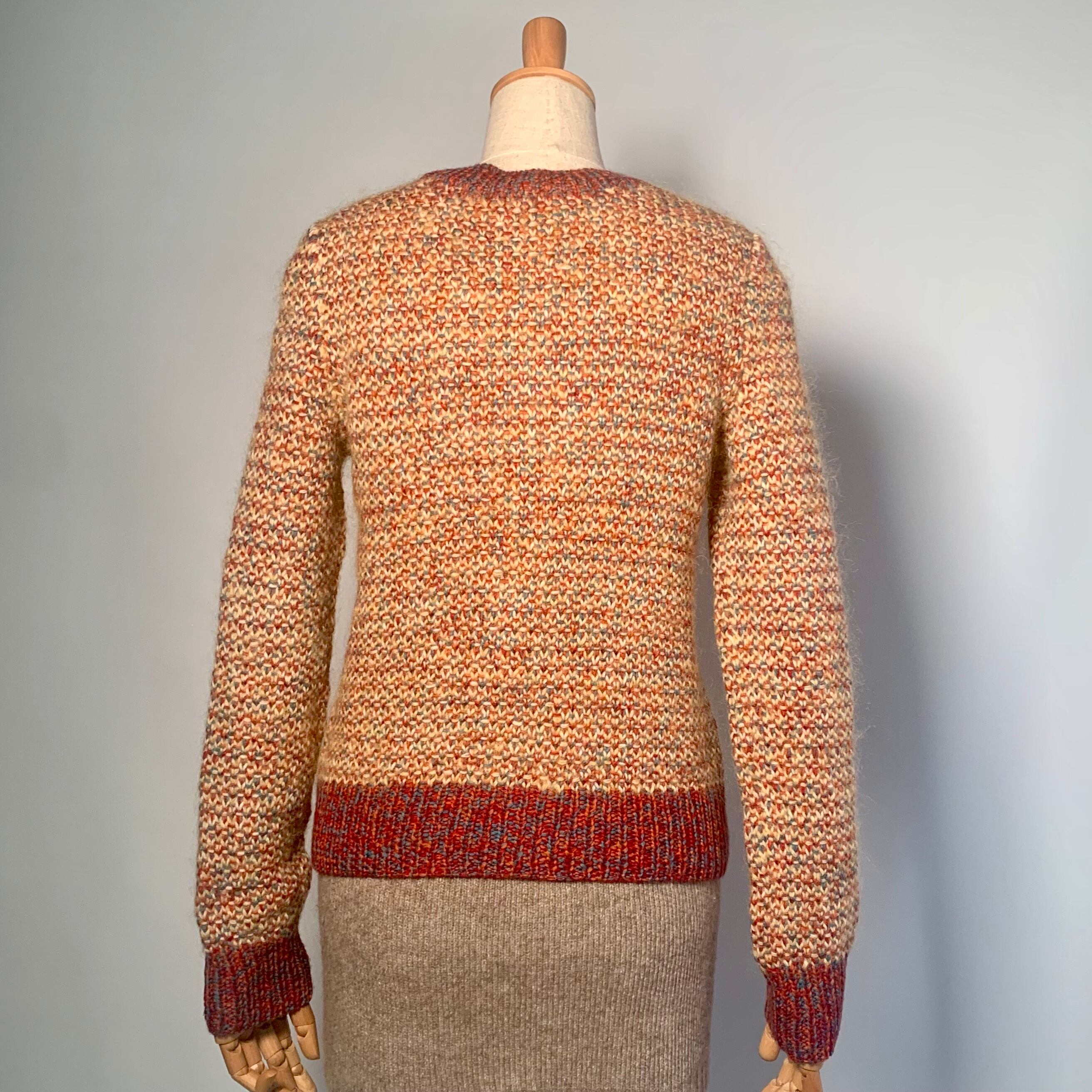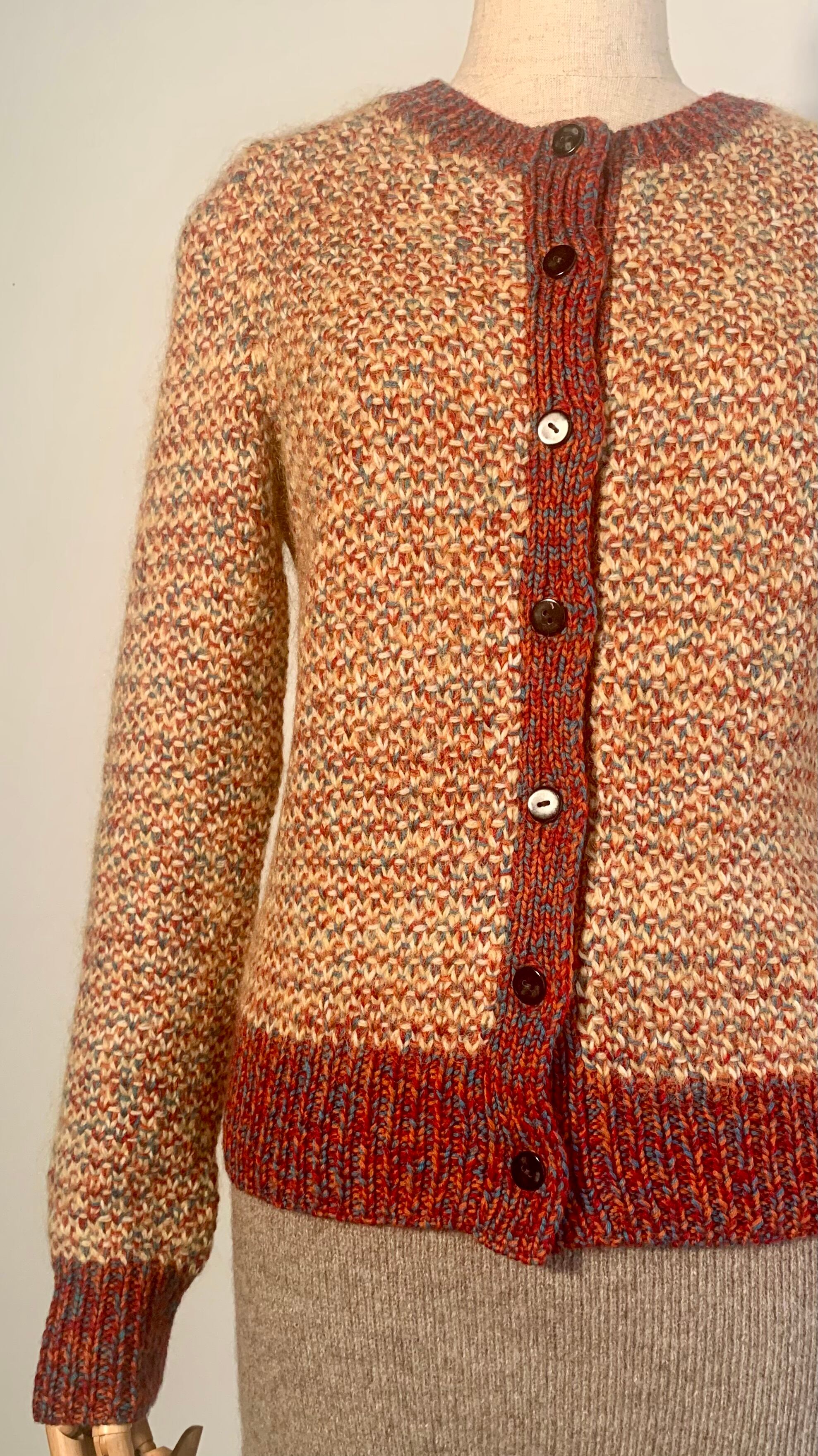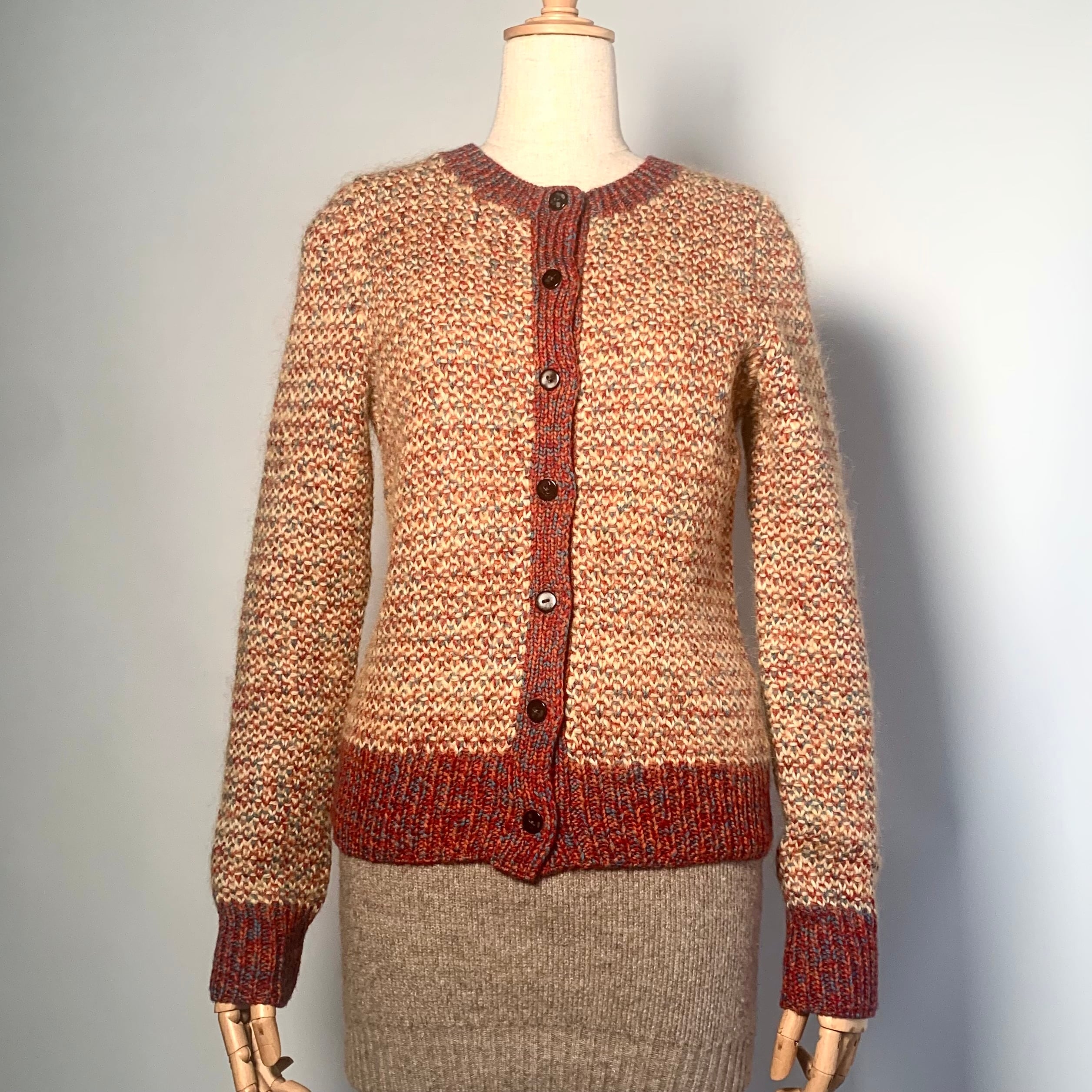 淡いイエローのモヘヤ混の糸とオフ白のラムウールの撚り合わせと、3色ミックスしたのメリノウールで編み立てた、優しいカラフルなツィード調の手編みニットカーディガン。