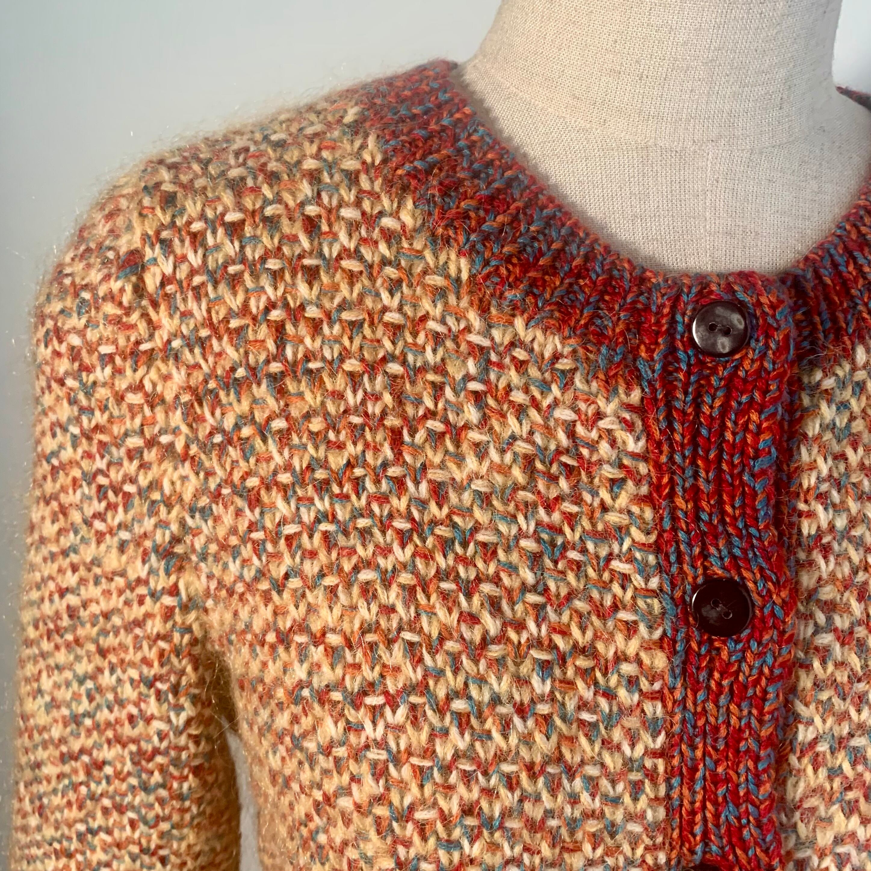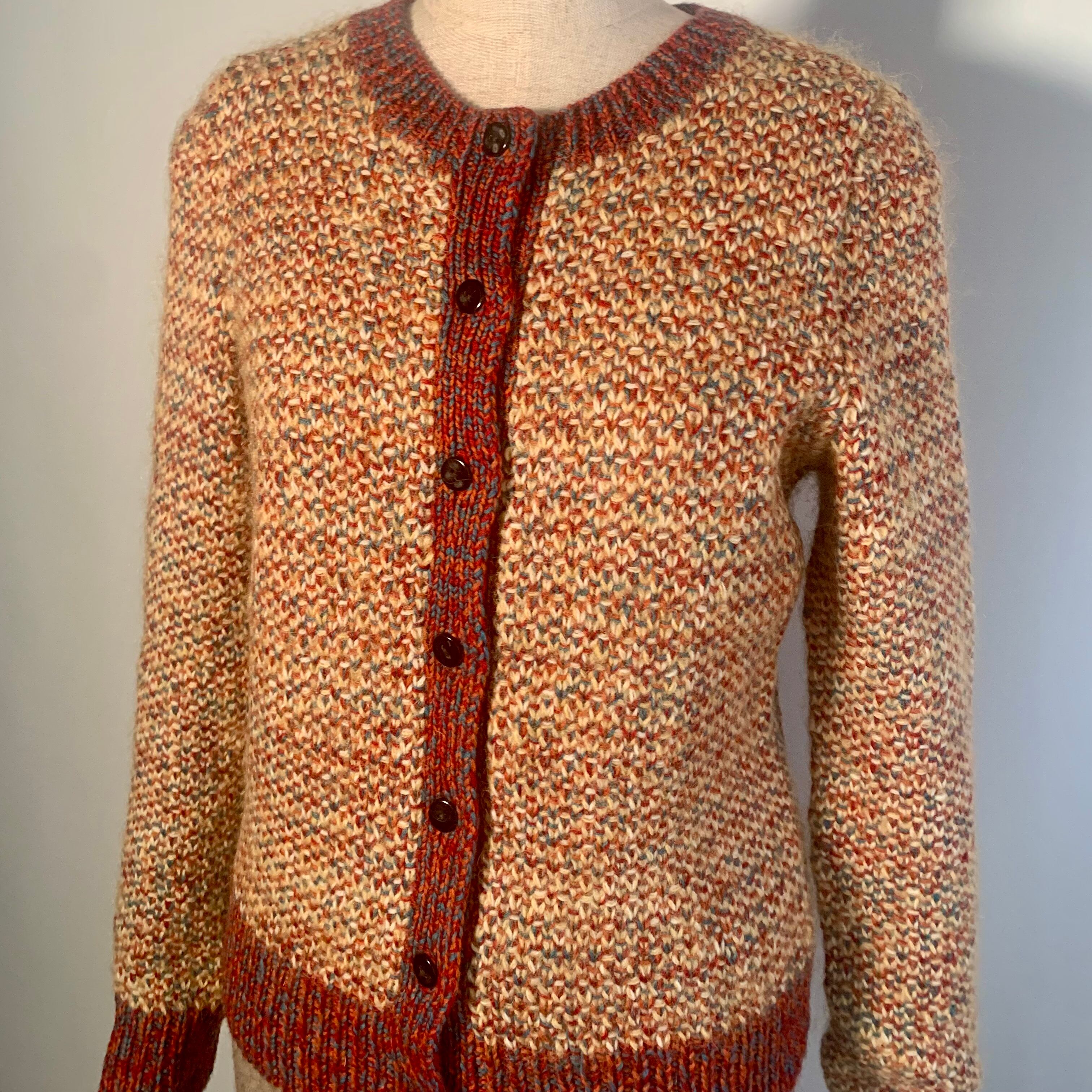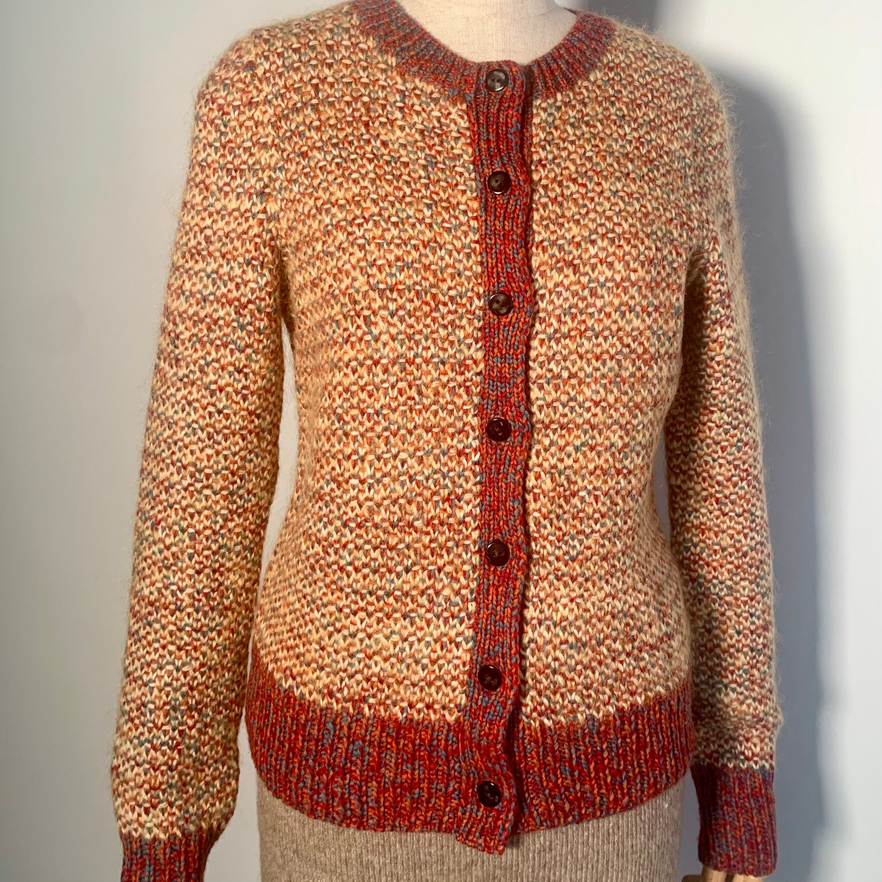 淡いイエローのモヘヤ混の糸とオフ白のラムウールの撚り合わせと、3色ミックスしたのメリノウールで編み立てた、優しいカラフルなツィード調の手編みニットカーディガン。