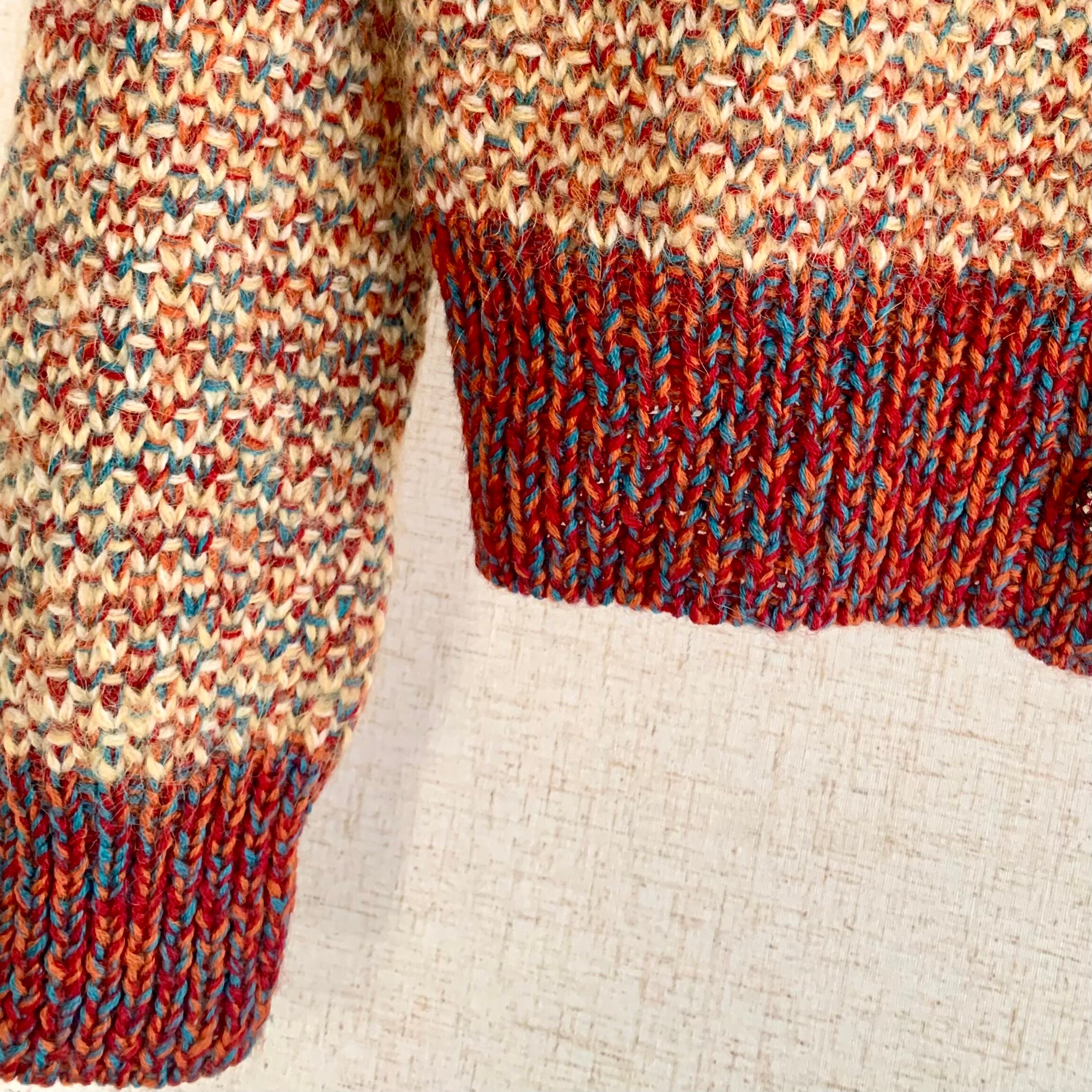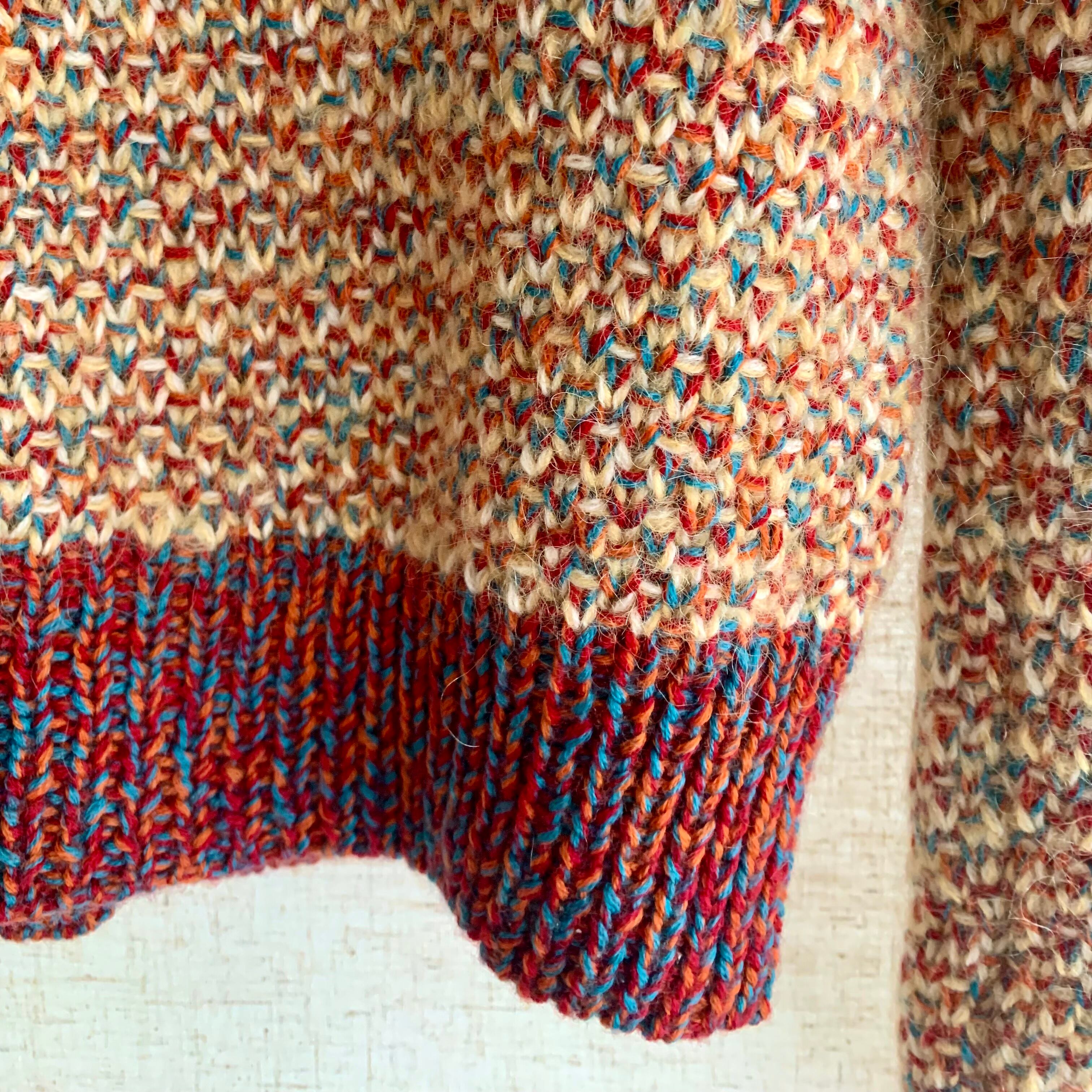 衿ぐり、前たて、裾、袖口は、レッド系のミックスカラーの毛糸のリブ編み仕立て。