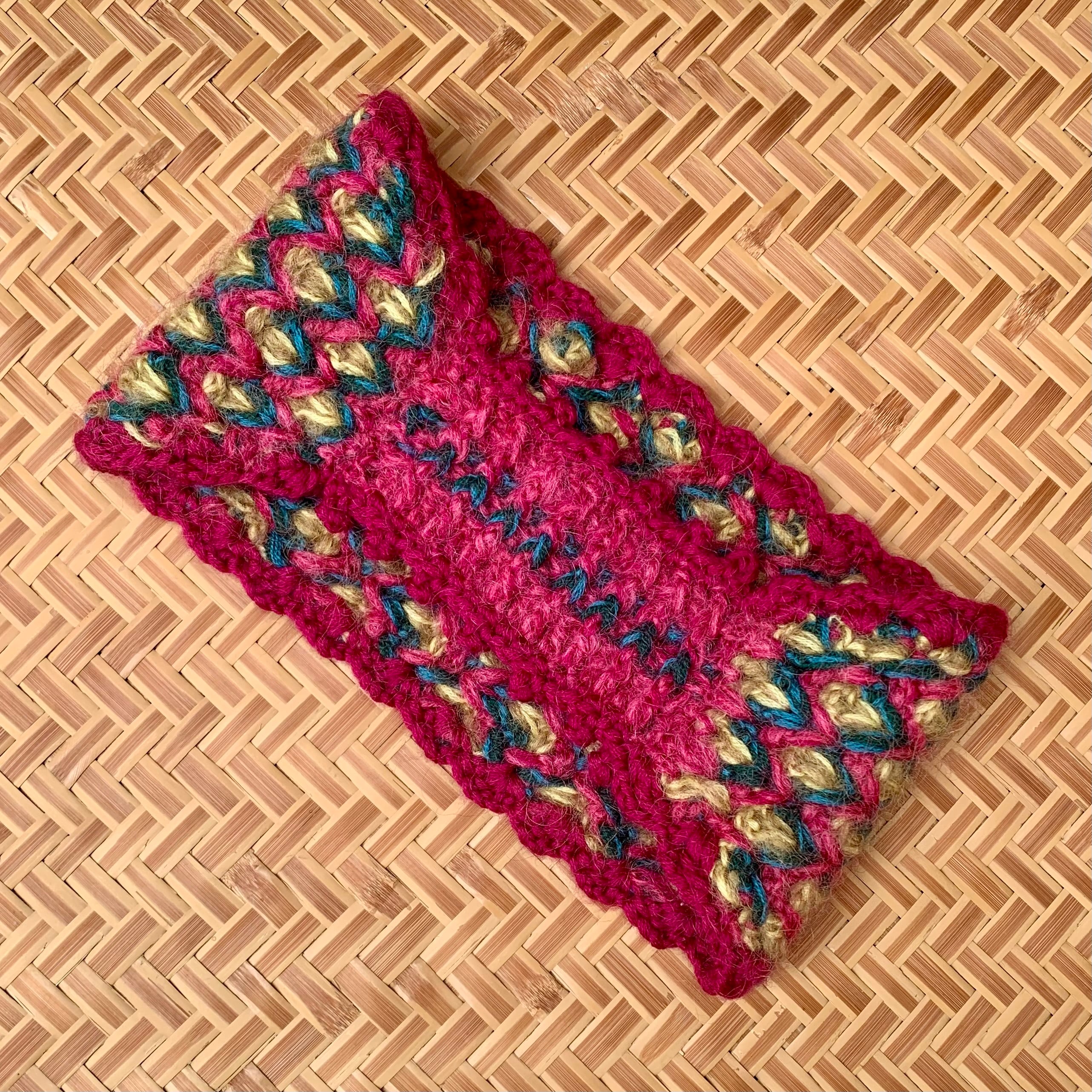 ・3色の毛糸でひし形状の模様にクロシェ手編みで仕上げています。