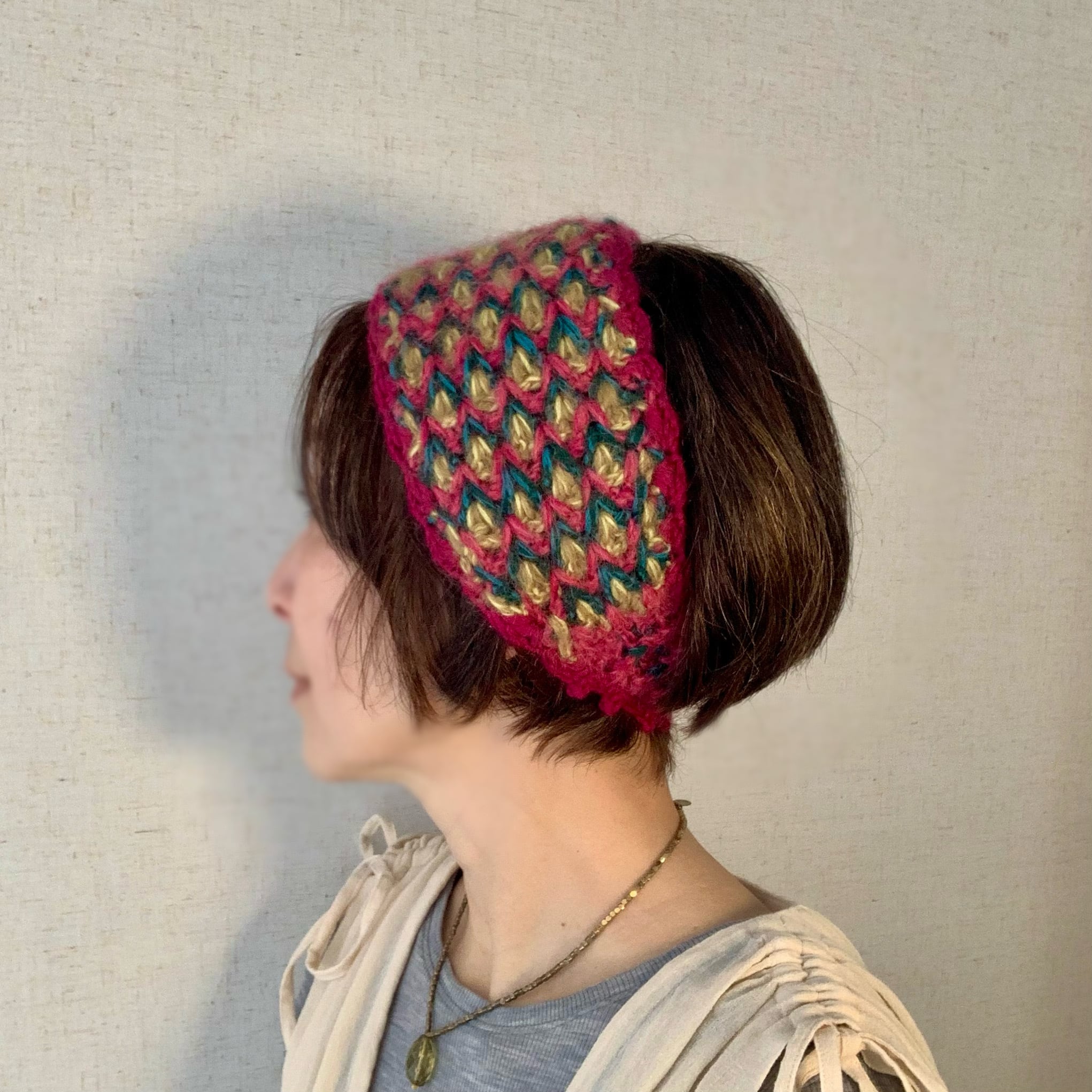 立体的なひし形模様のかぎ針編みのへアバンドです。