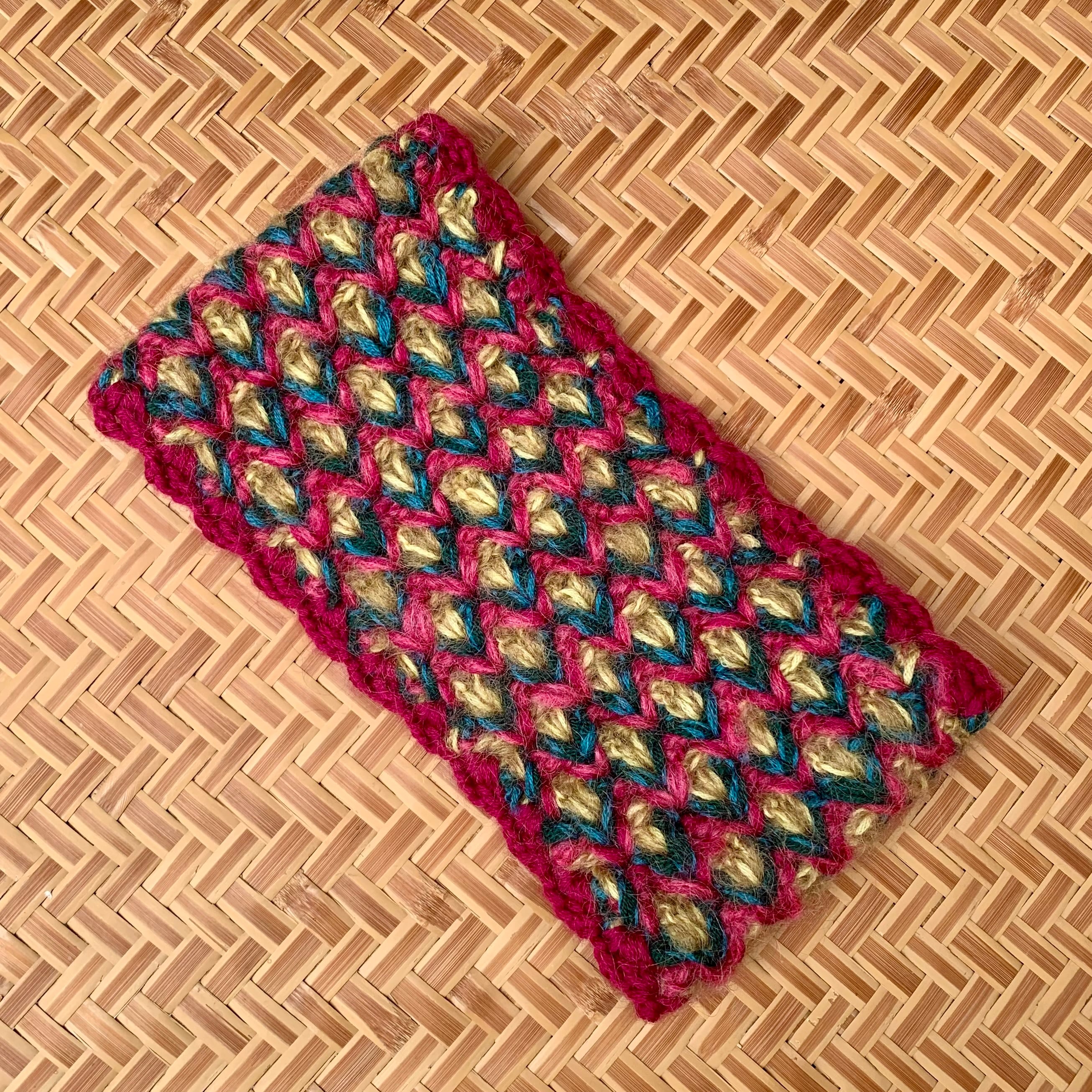 ・3色の毛糸でひし形状の模様にクロシェ編みをします。