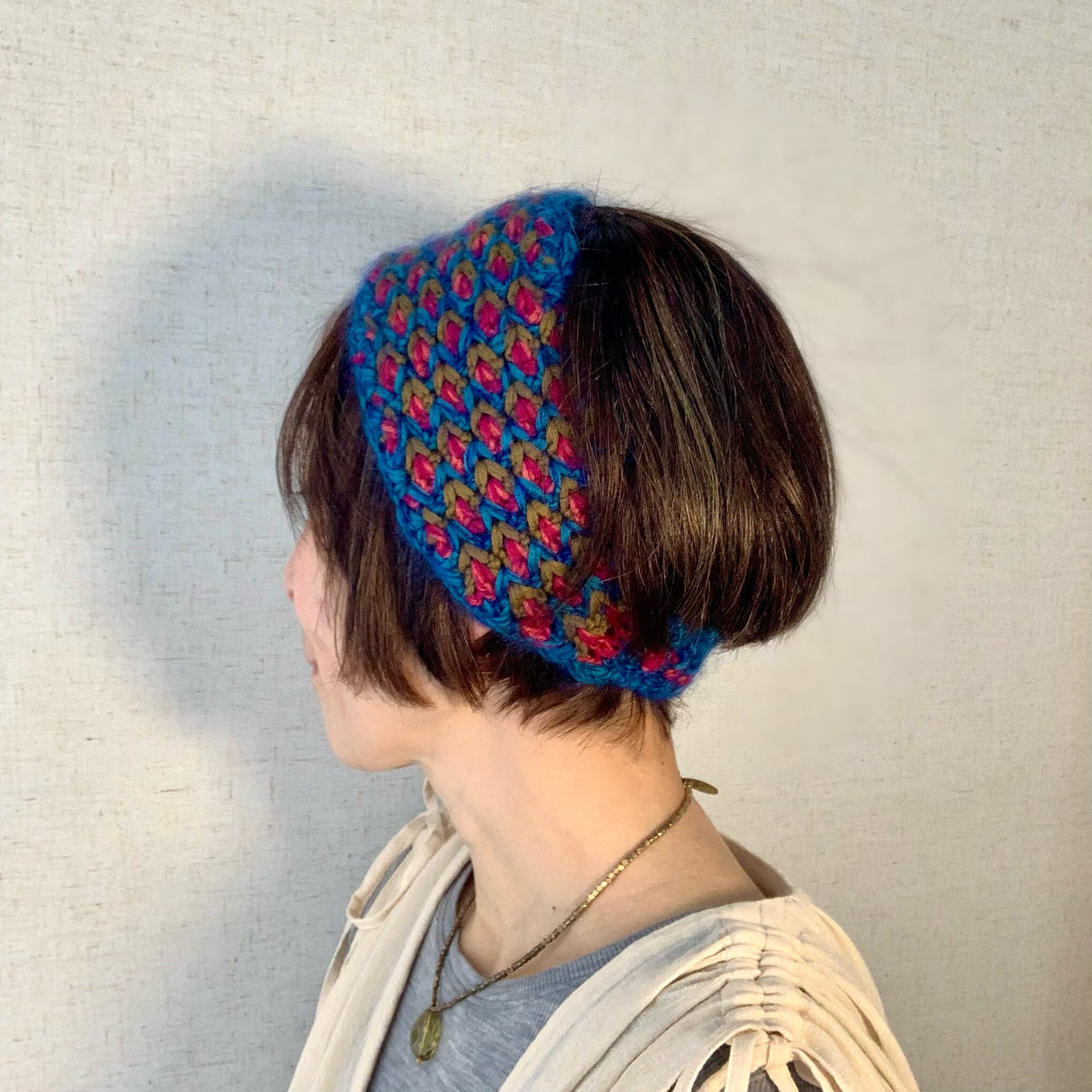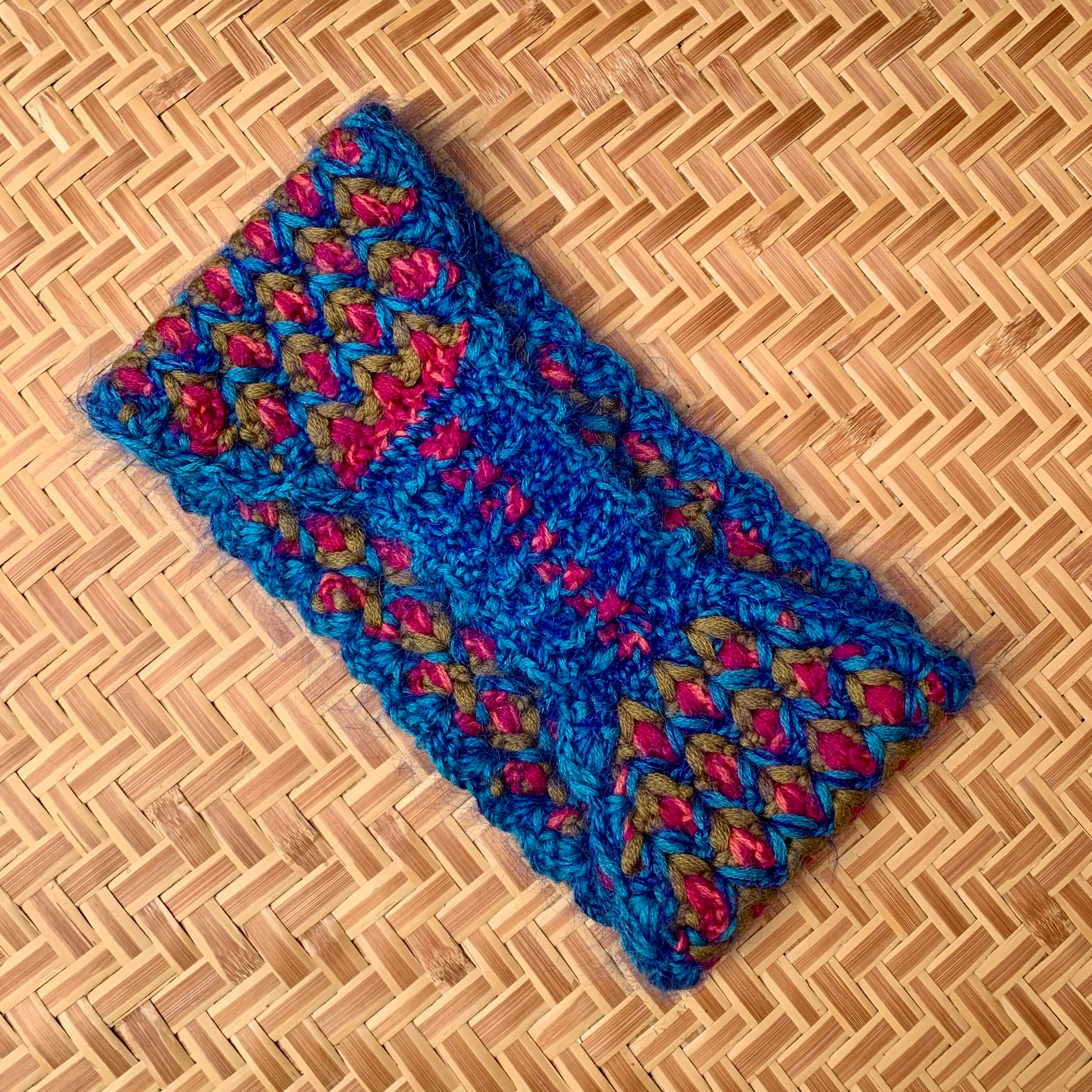 立体的なひし形模様のかぎ針編みのへアバンドです。