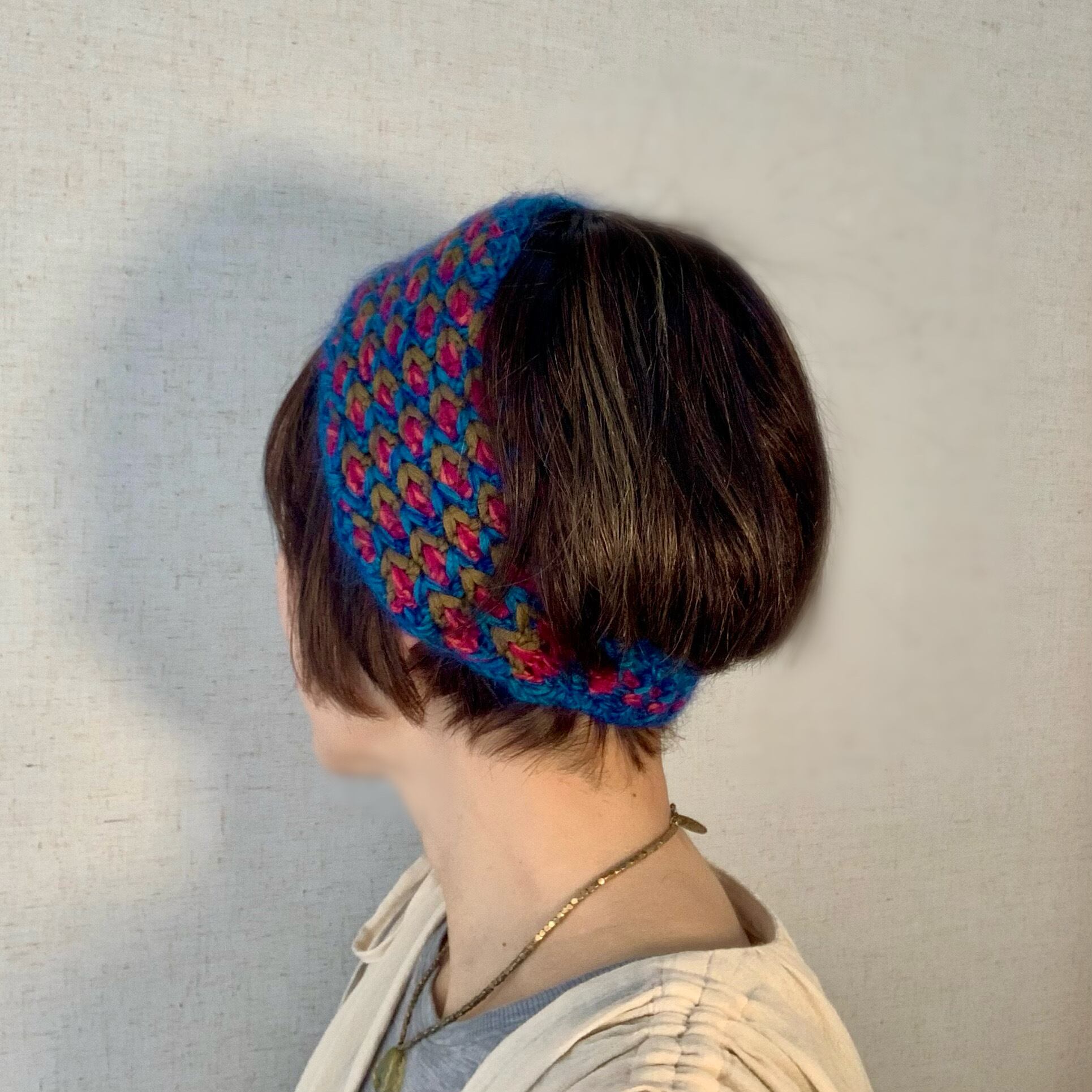 ・細巾部分も伸縮性のあるかぎ針編みを利用してゴム無しでも頭にフィットしやすくなっています。