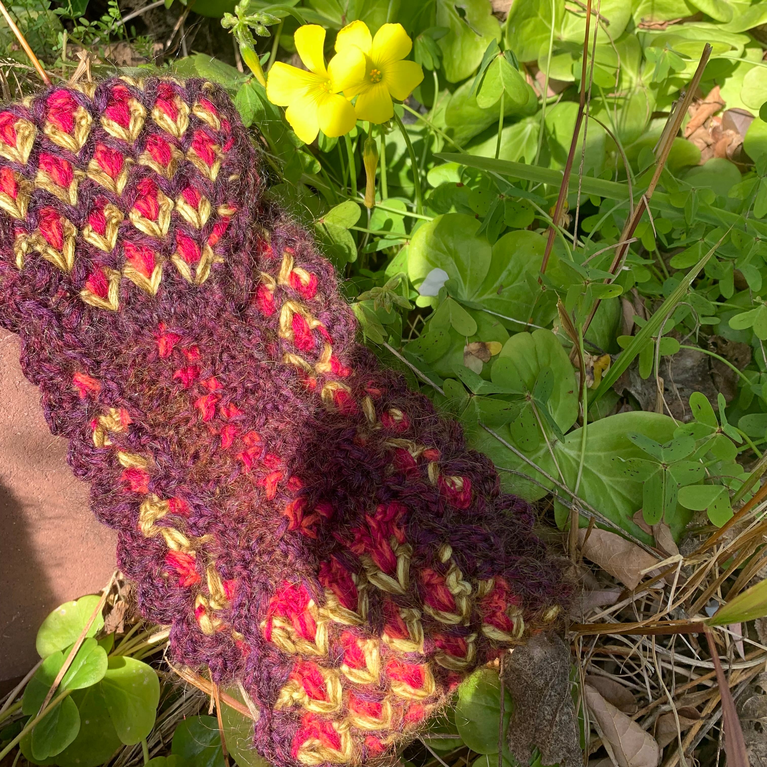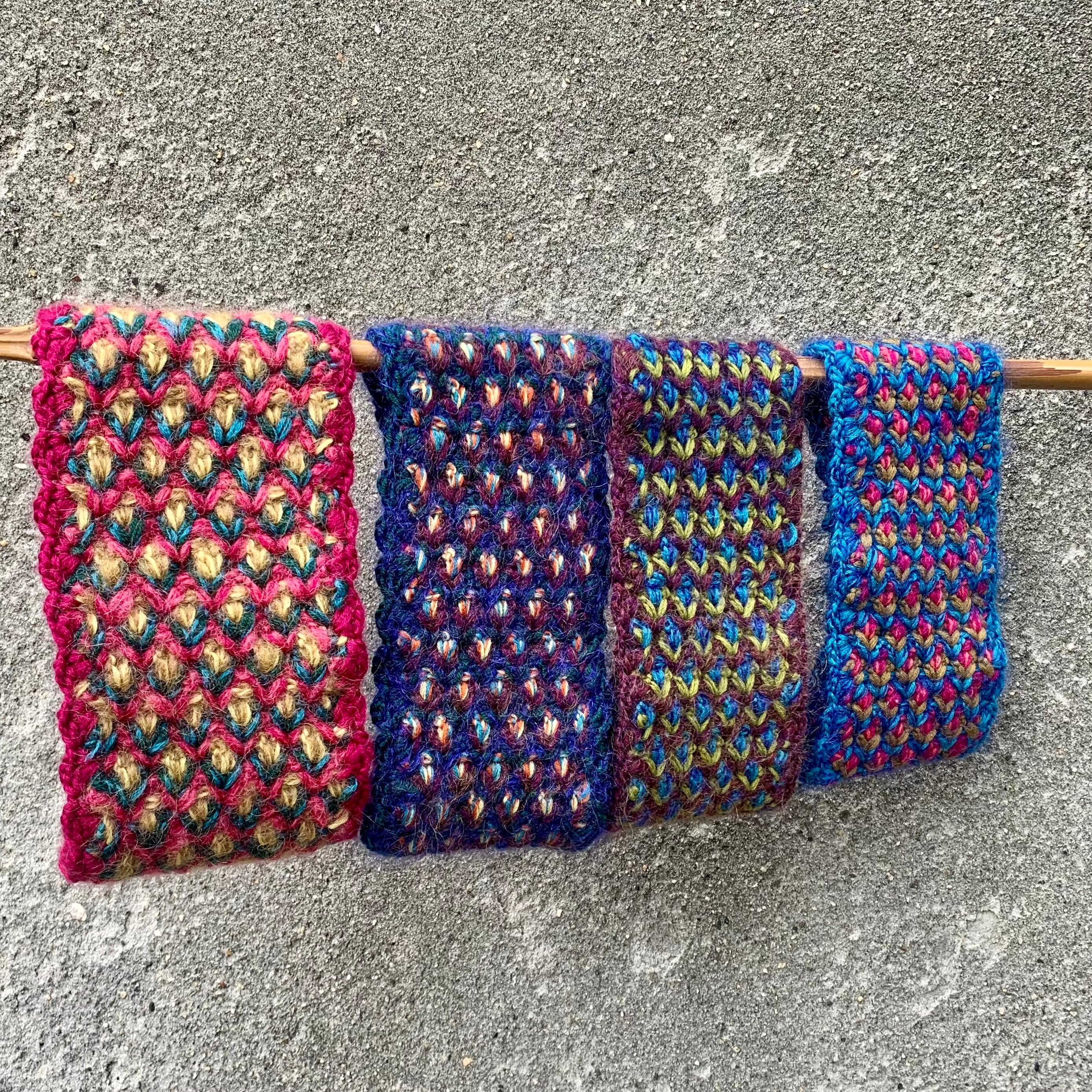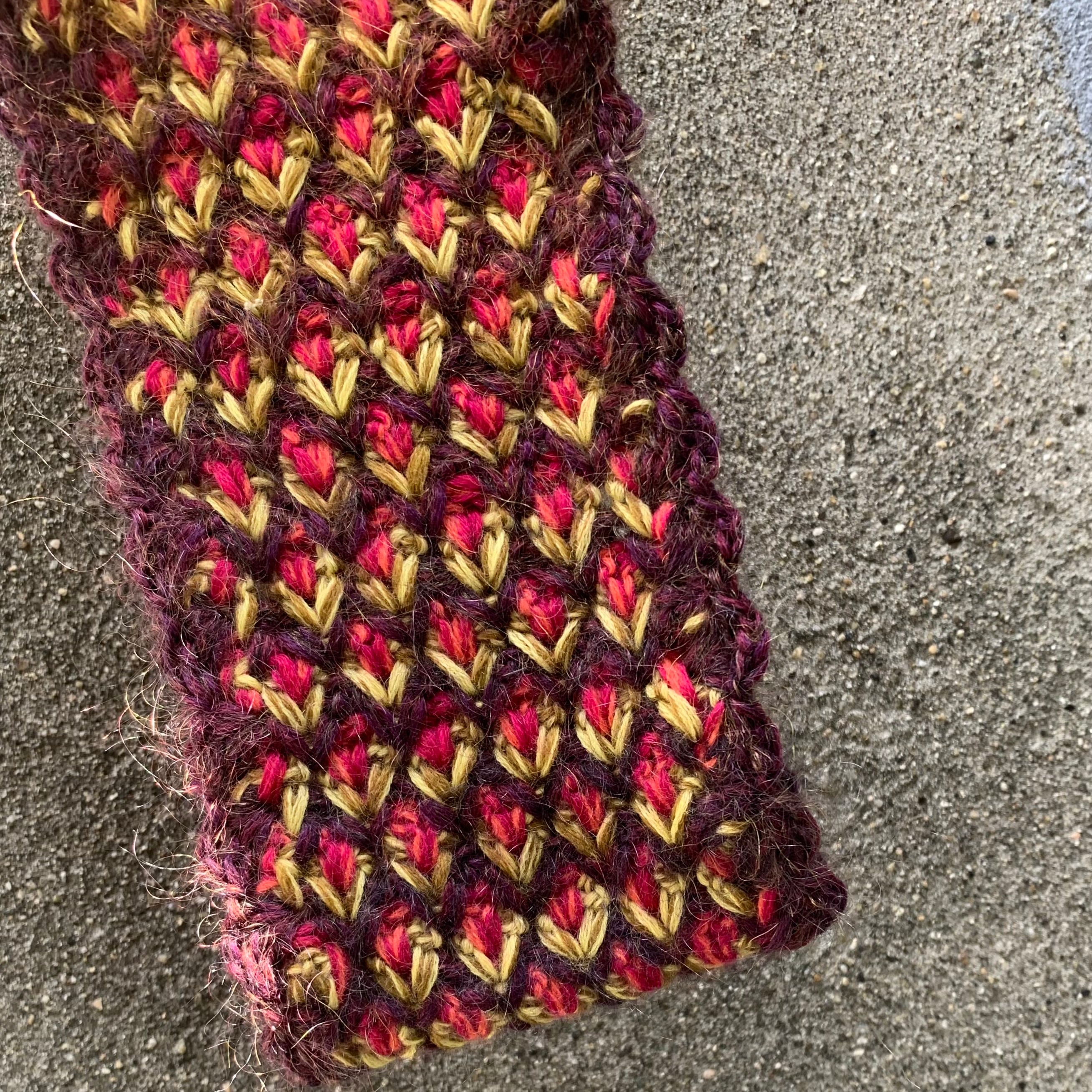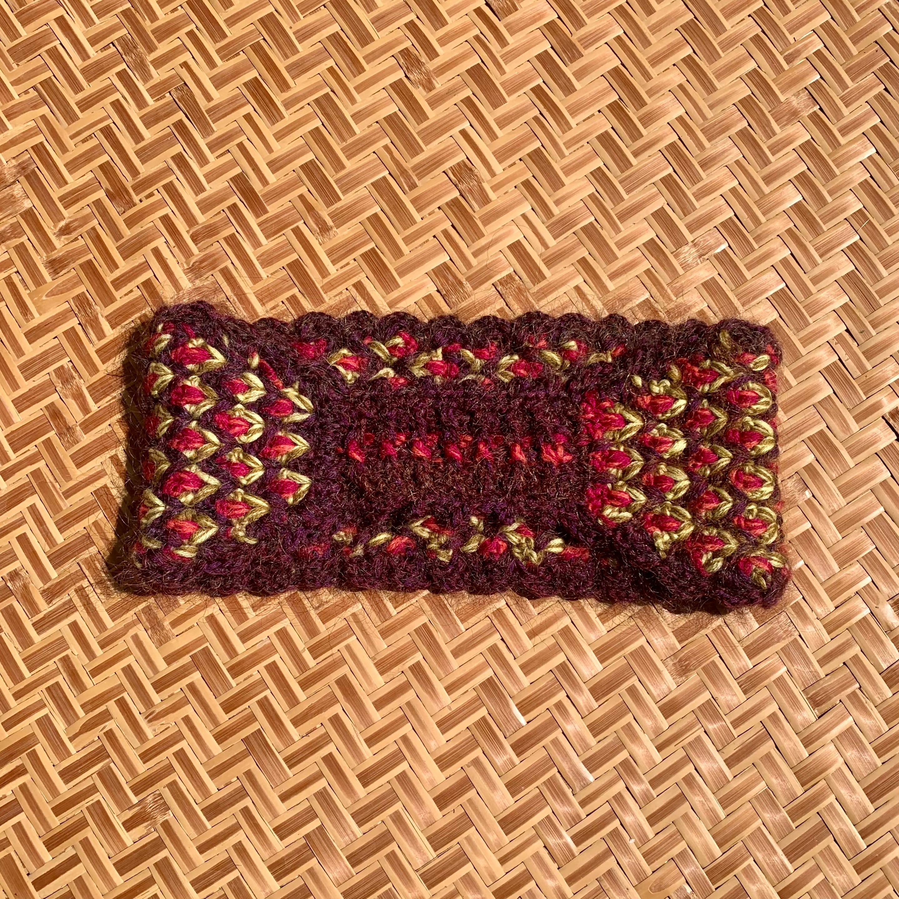 ・3色の毛糸でひし形状の模様にクロシェ手編みで仕上げています。