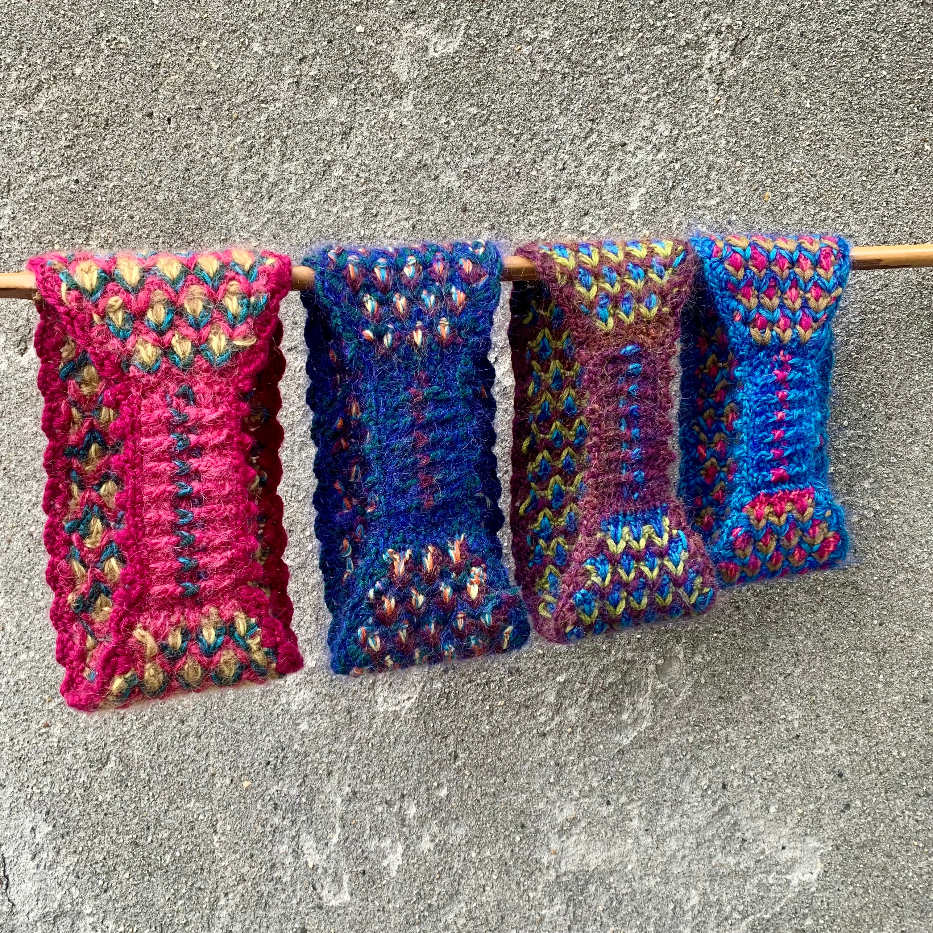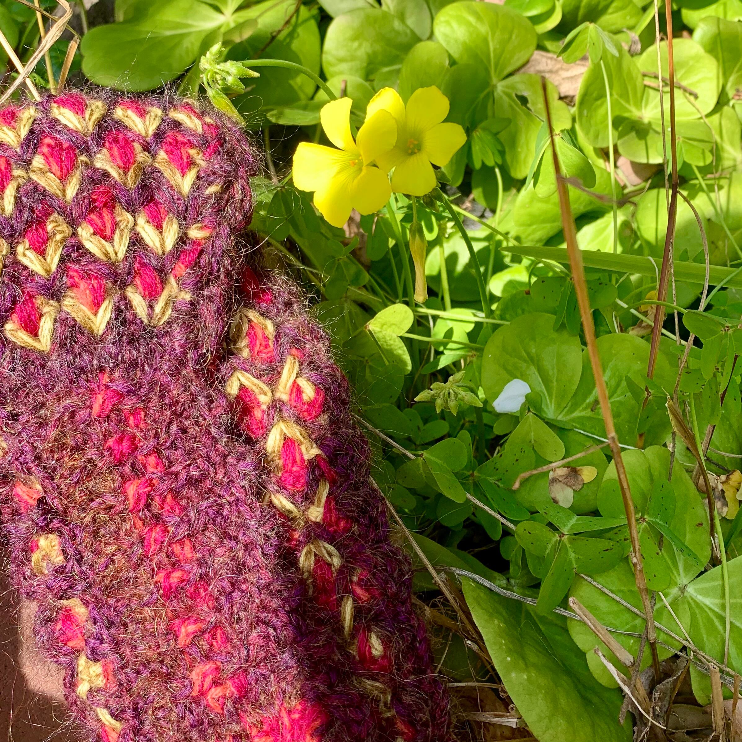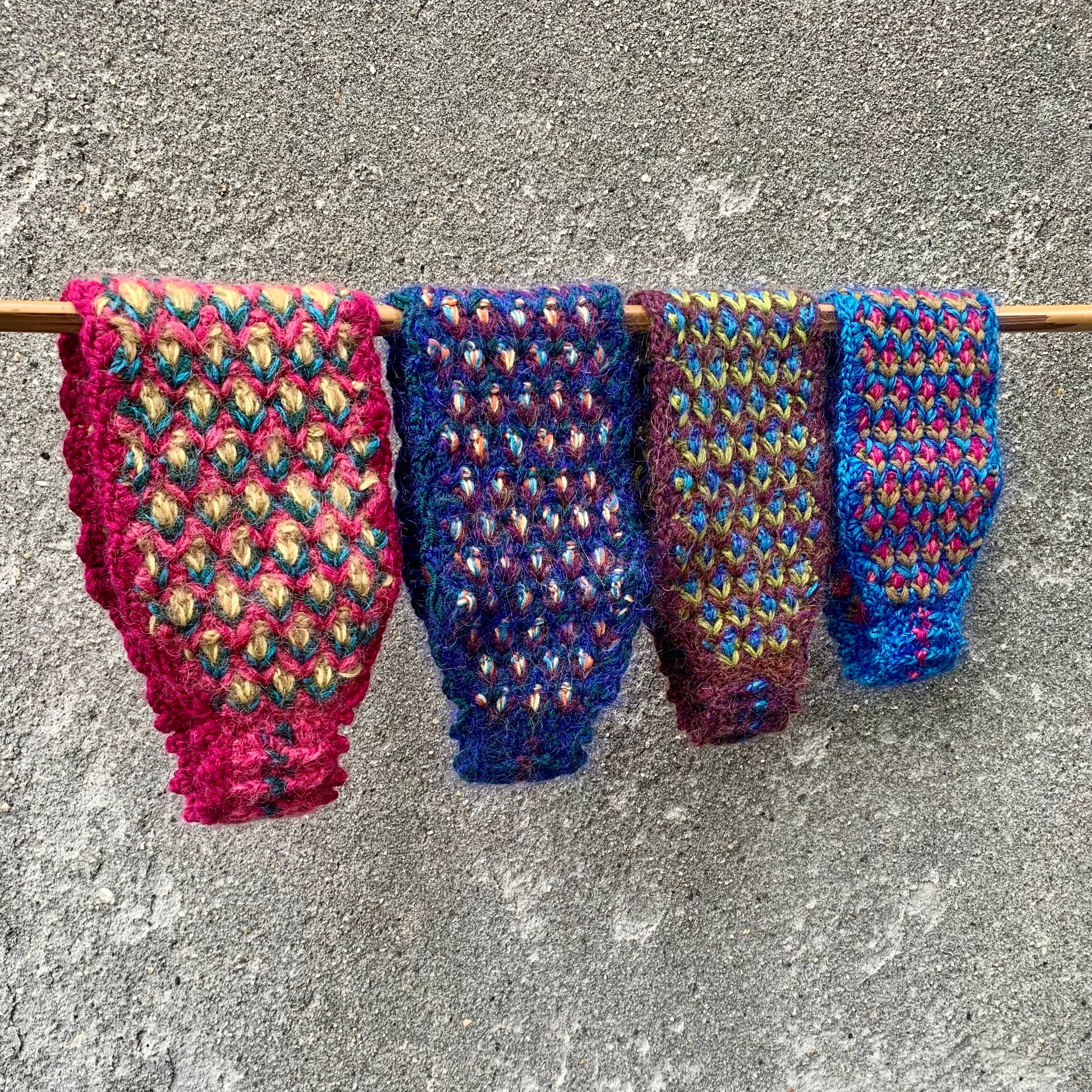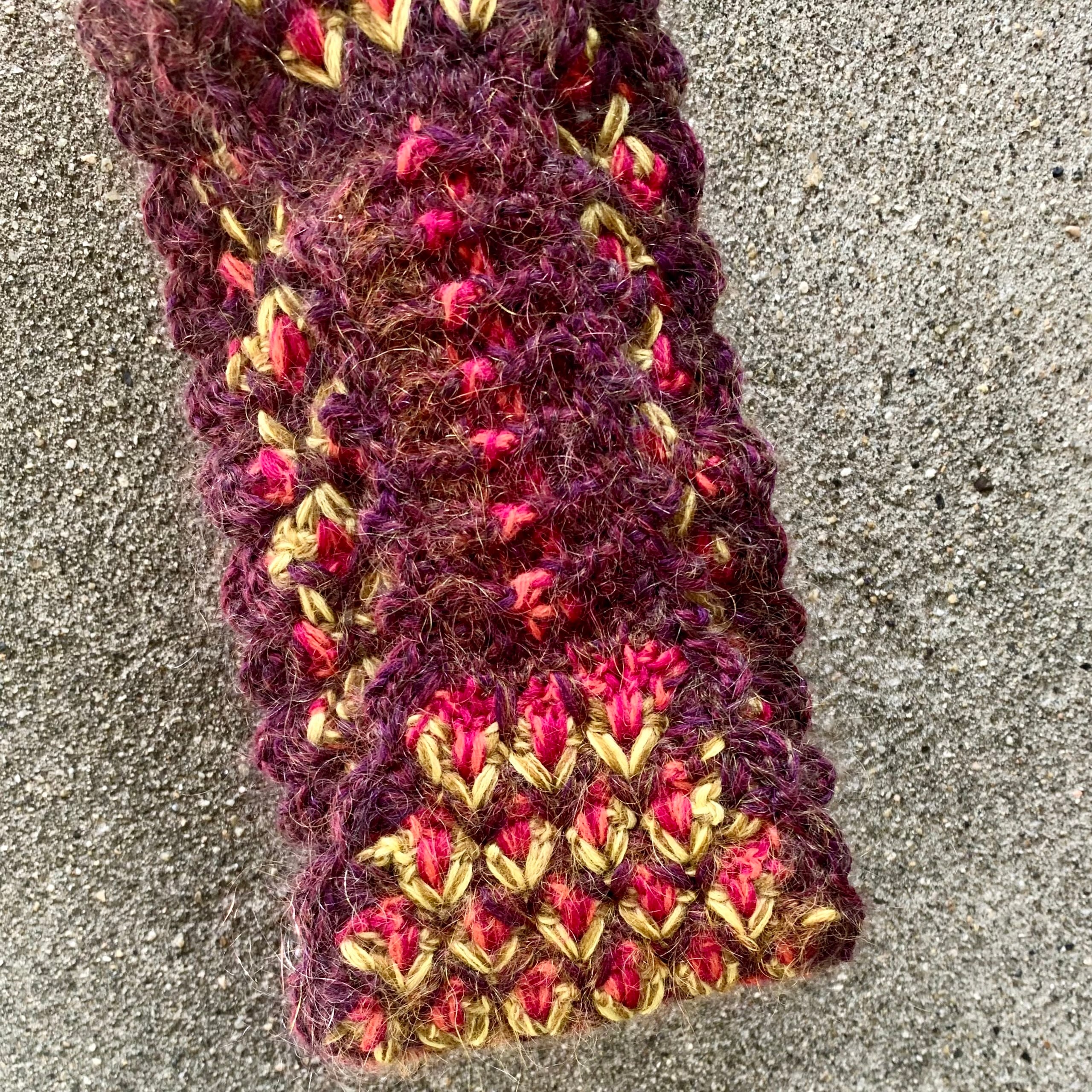・3色の毛糸でひし形状の模様にクロシェ手編みで仕上げています。