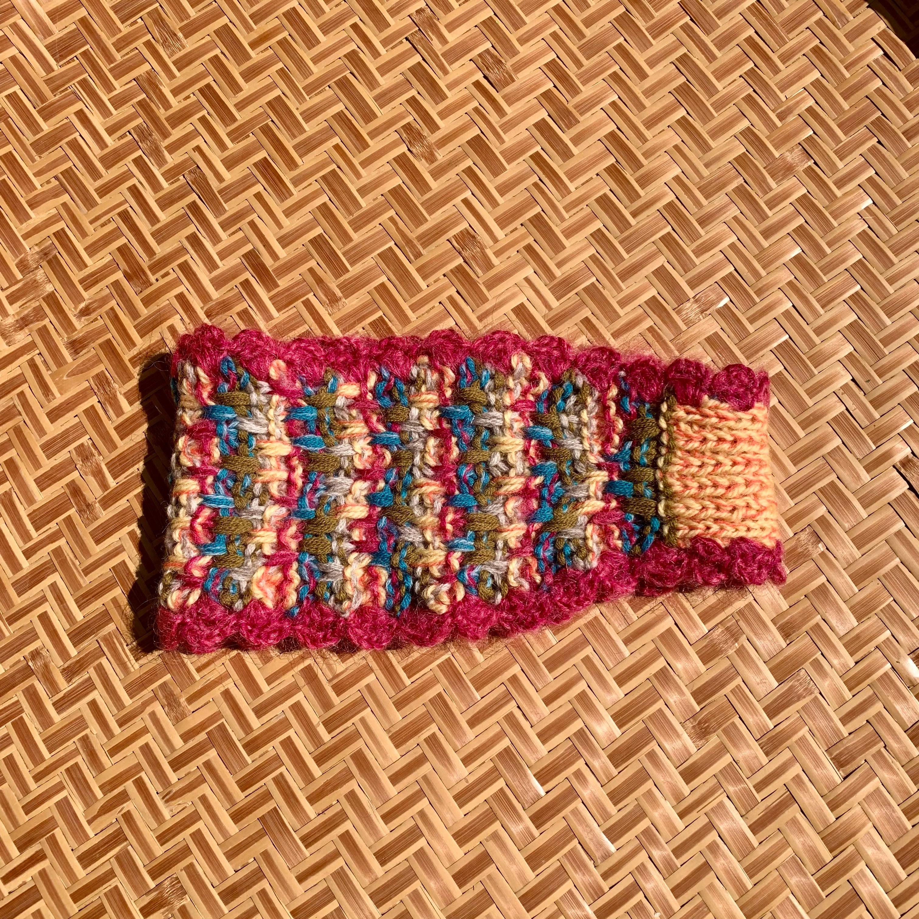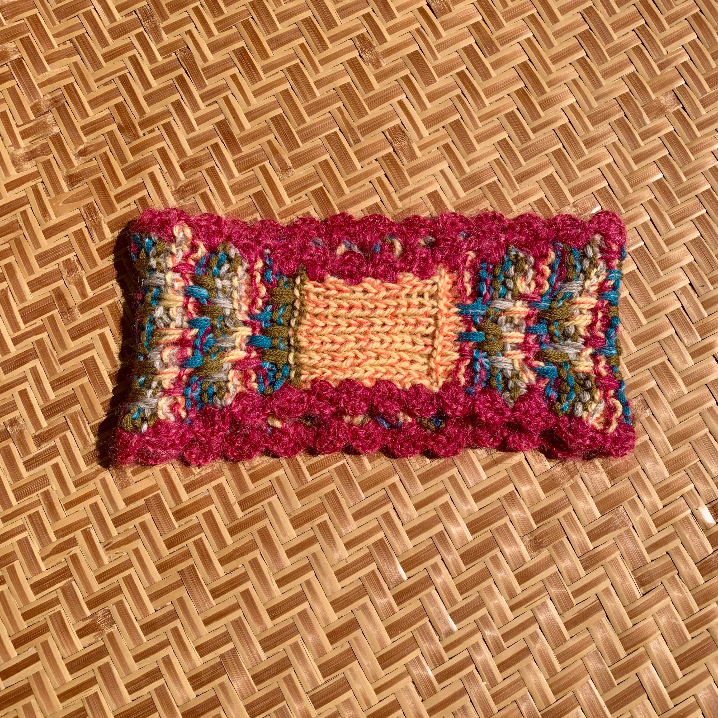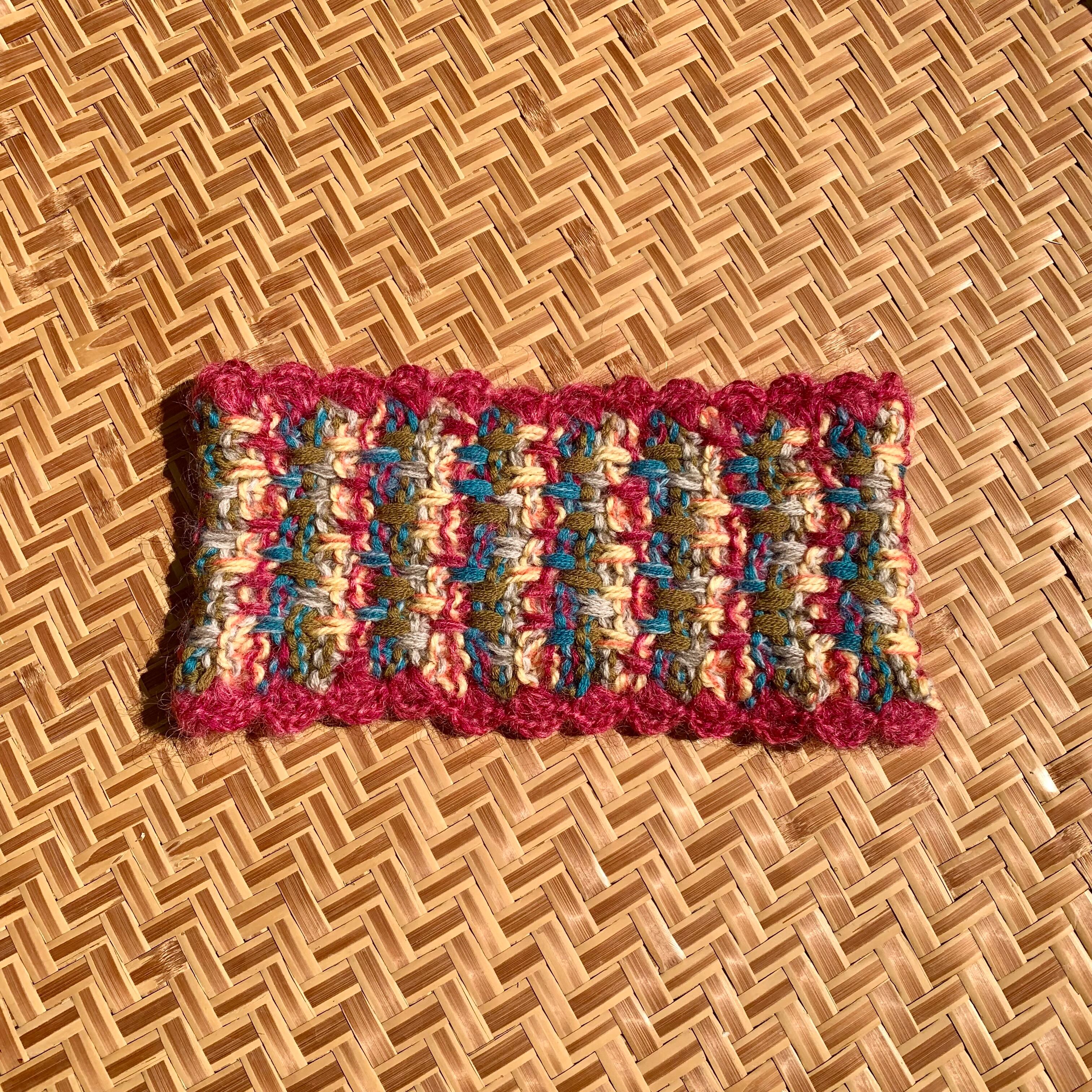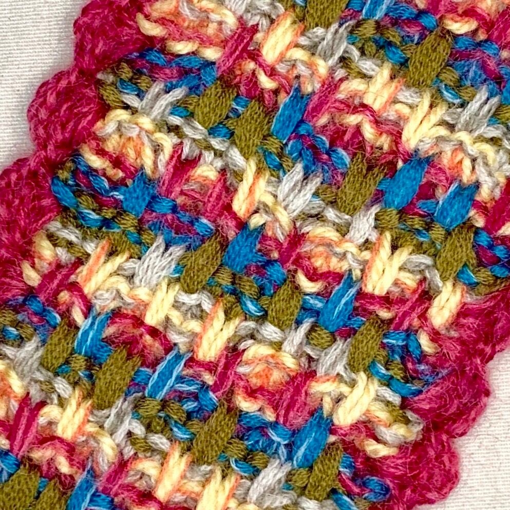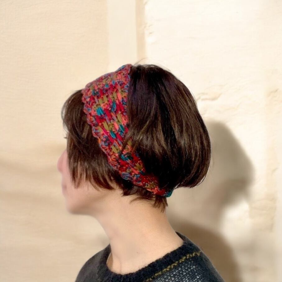・ランダム格子柄のように編み上げたヘアバンド。それぞれの糸は単色だったり、撚糸して色が混ざり合ったり。
