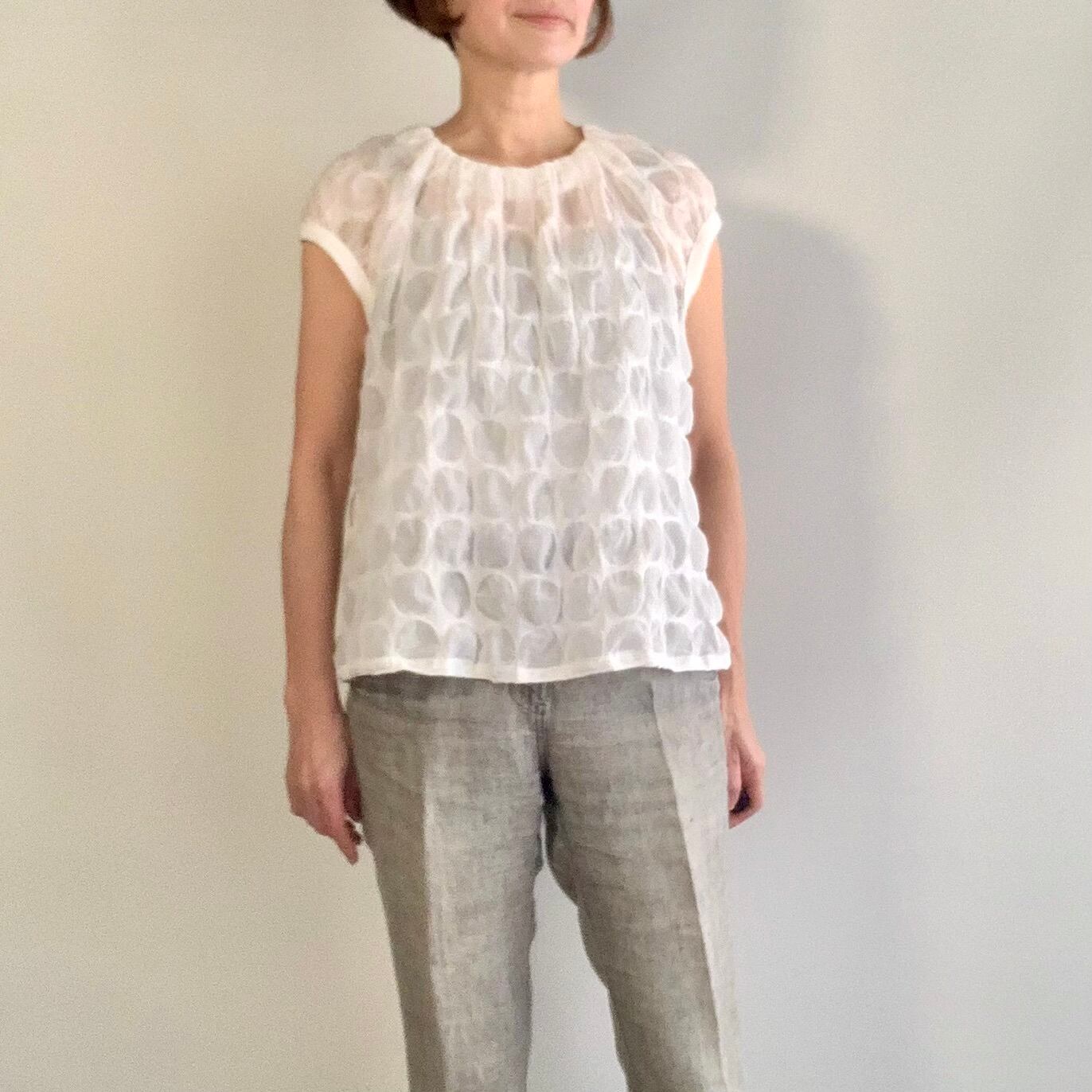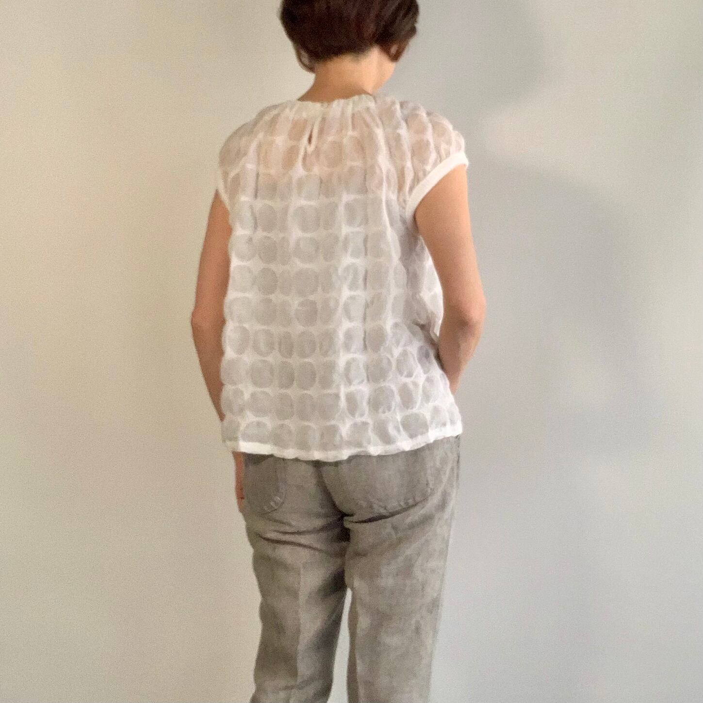 コットン ドット柄 ニットカフのショートスリーブ ブラウス c/#WH