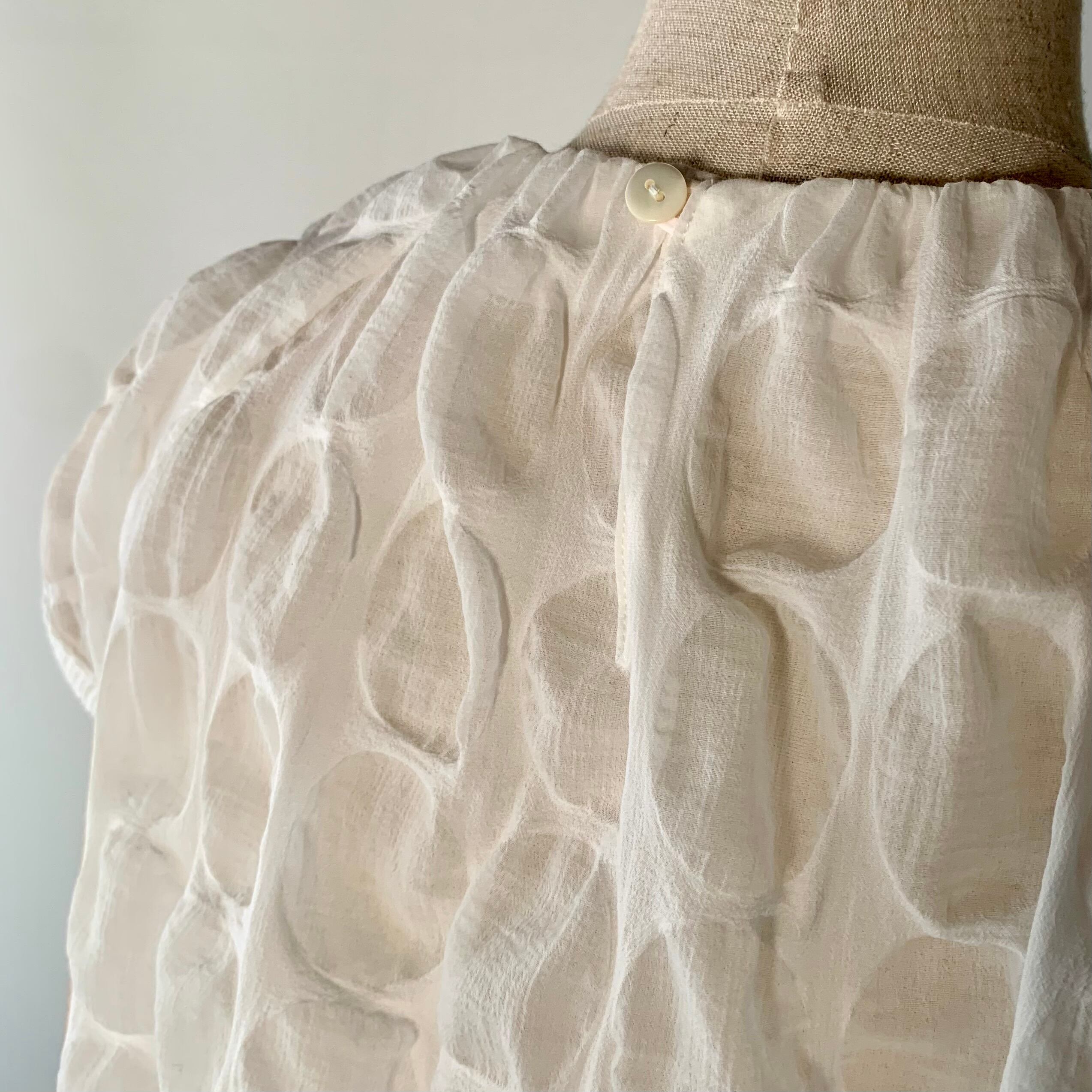 ・ブラックのコットンのクレープ素材をリップル加工し、ドット部分は透け感があってもタテ状のシボが透け感を和らげてくれます。