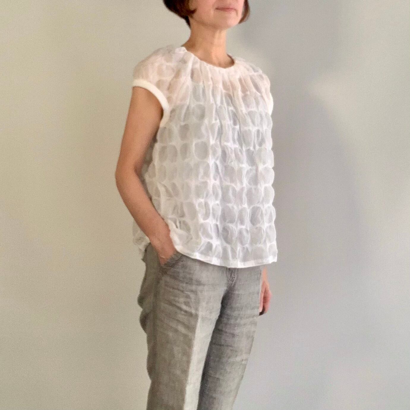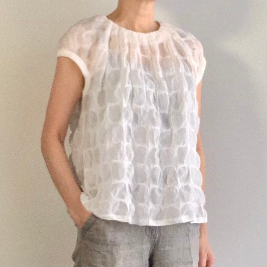 ドット柄のリップル加工のコットン素材で ショート丈のラグランスリーブ ブラウス。