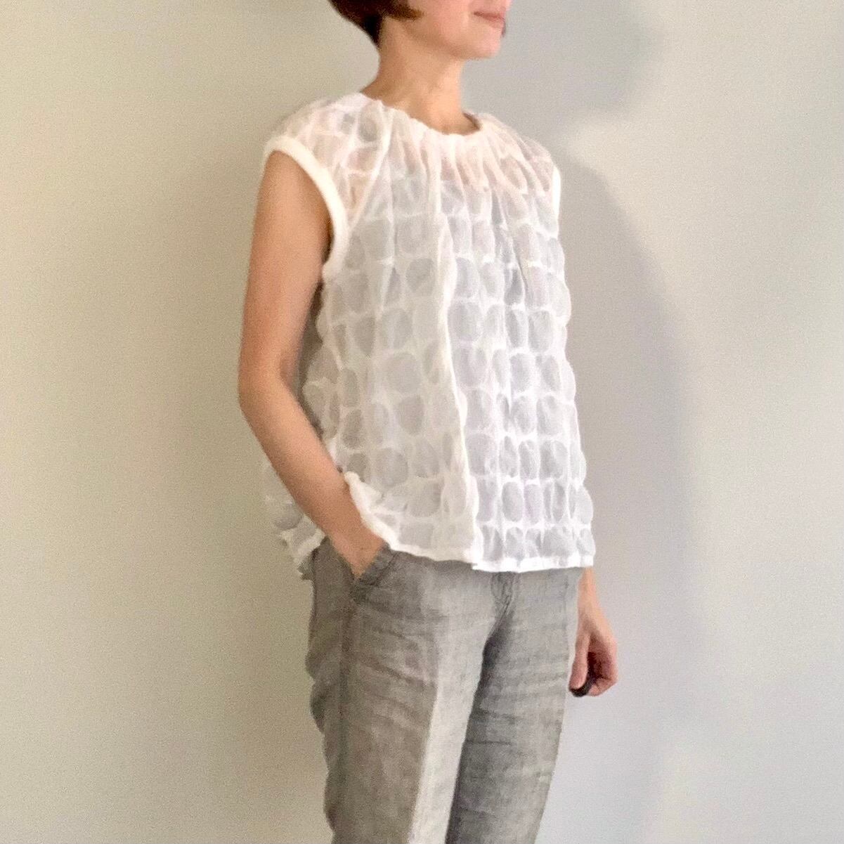 ・ブラックのコットンのクレープ素材をリップル加工し、ドット部分は透け感があってもタテ状のシボが透け感を和らげてくれます。