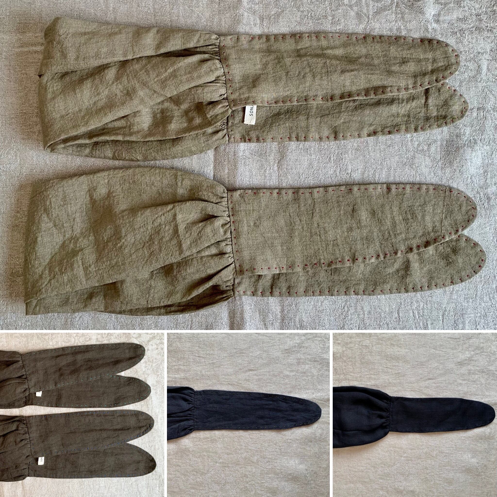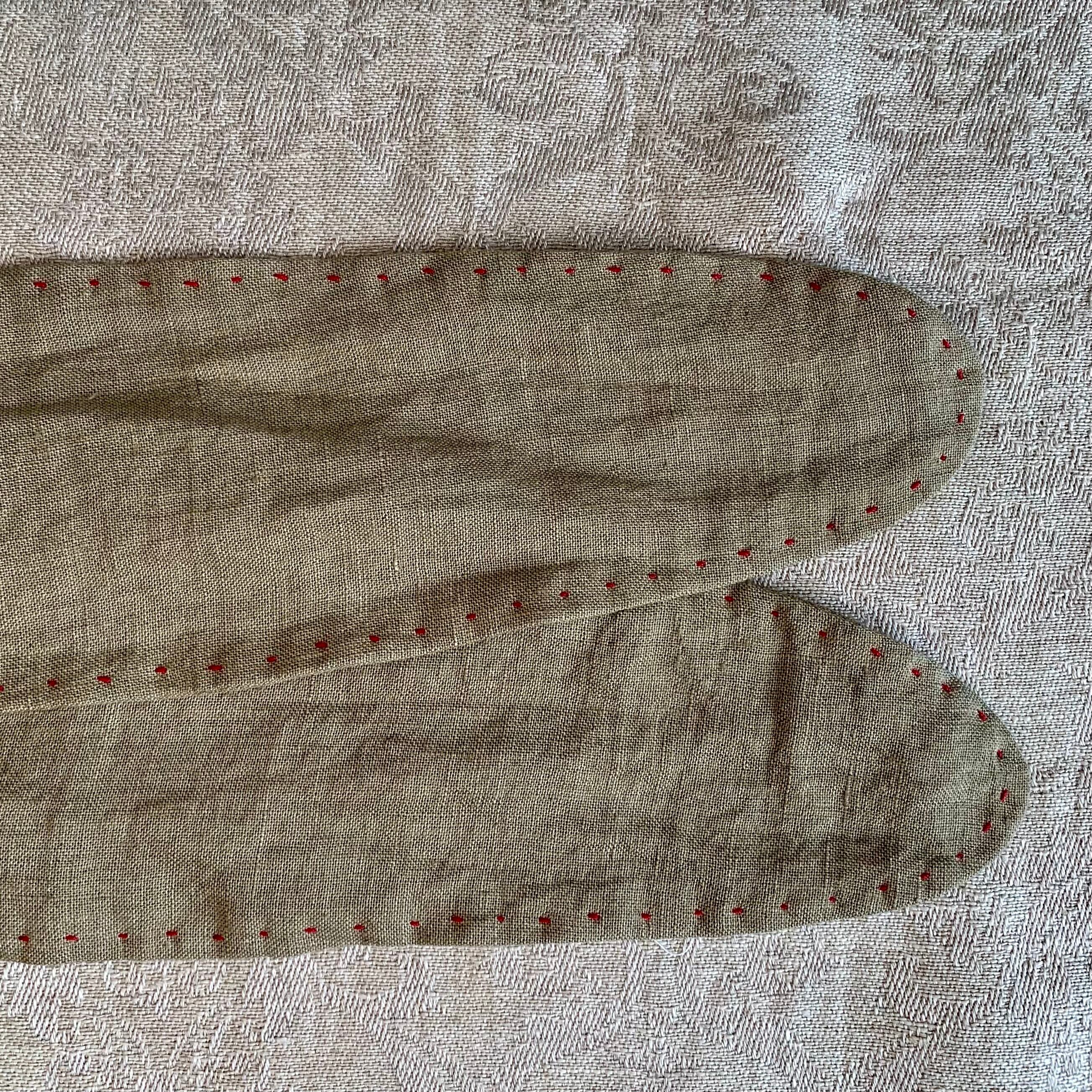 このカーキベージュには、赤のコットンのレース糸でハンドステッチを入れています。