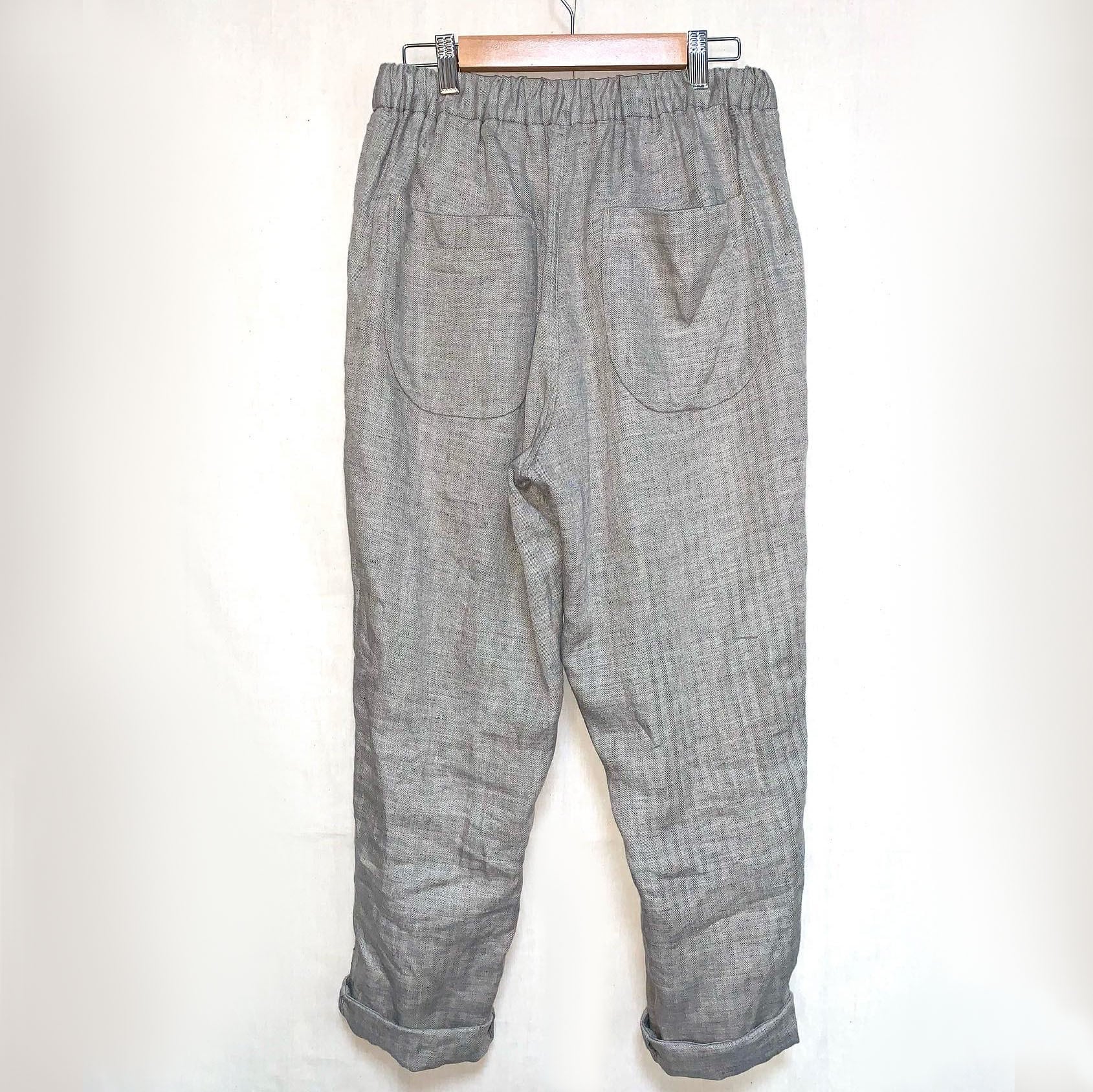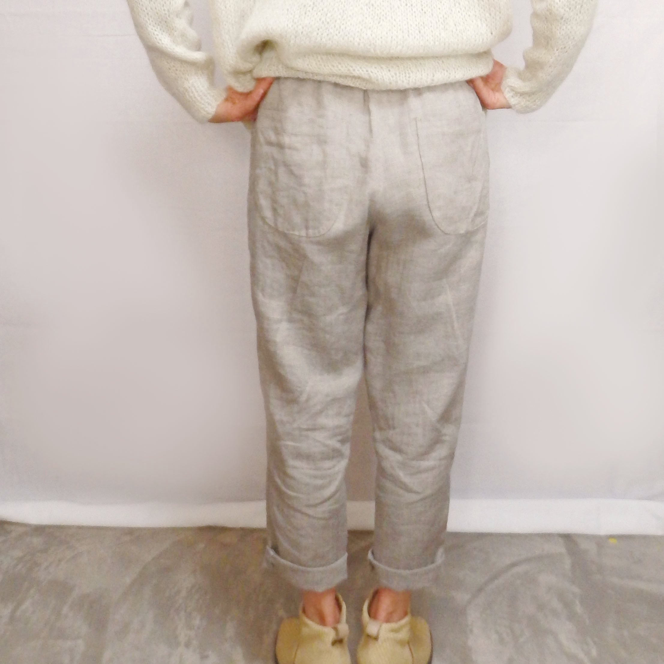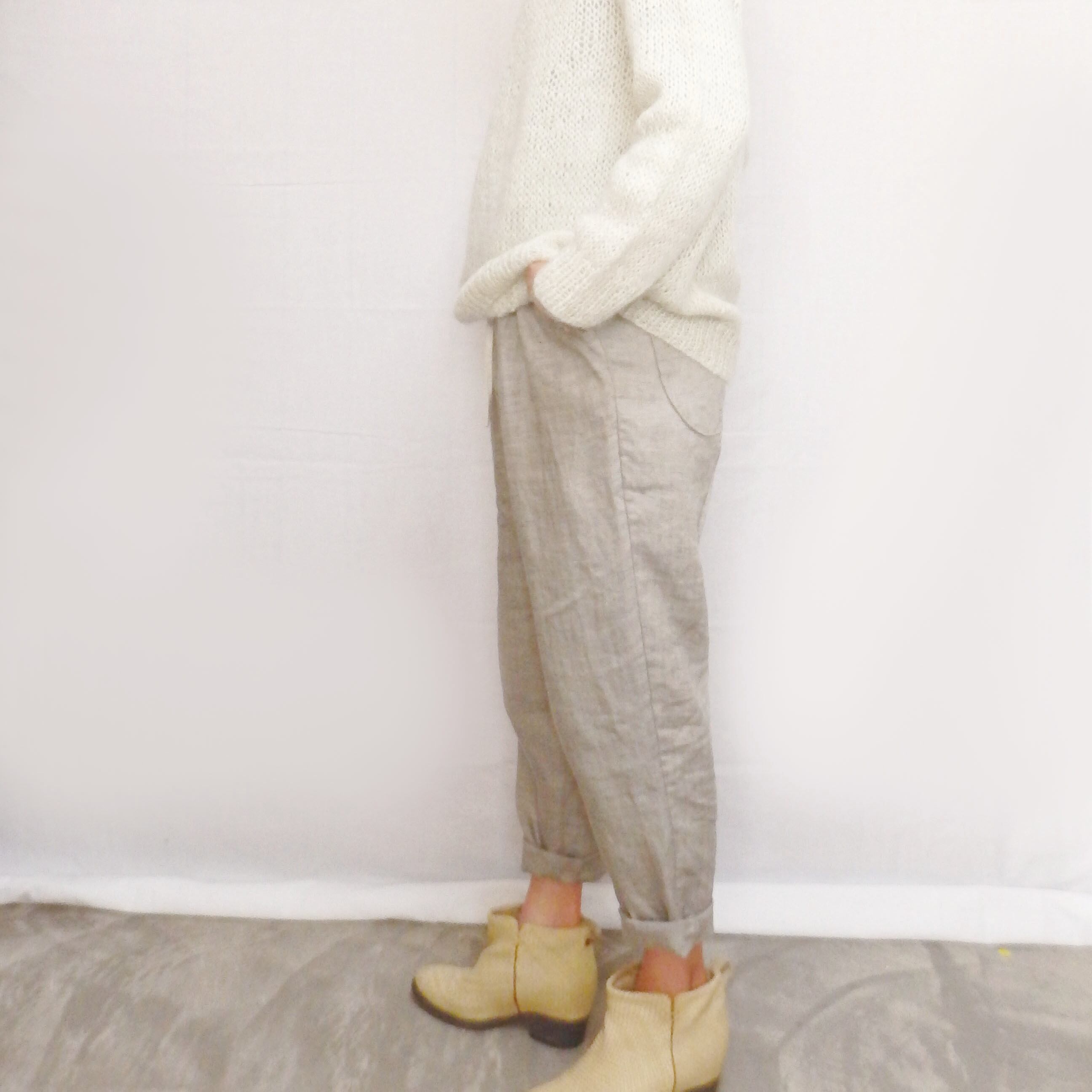 ・国産リネンヘリンボーンを使用したテーパードパンツ。
