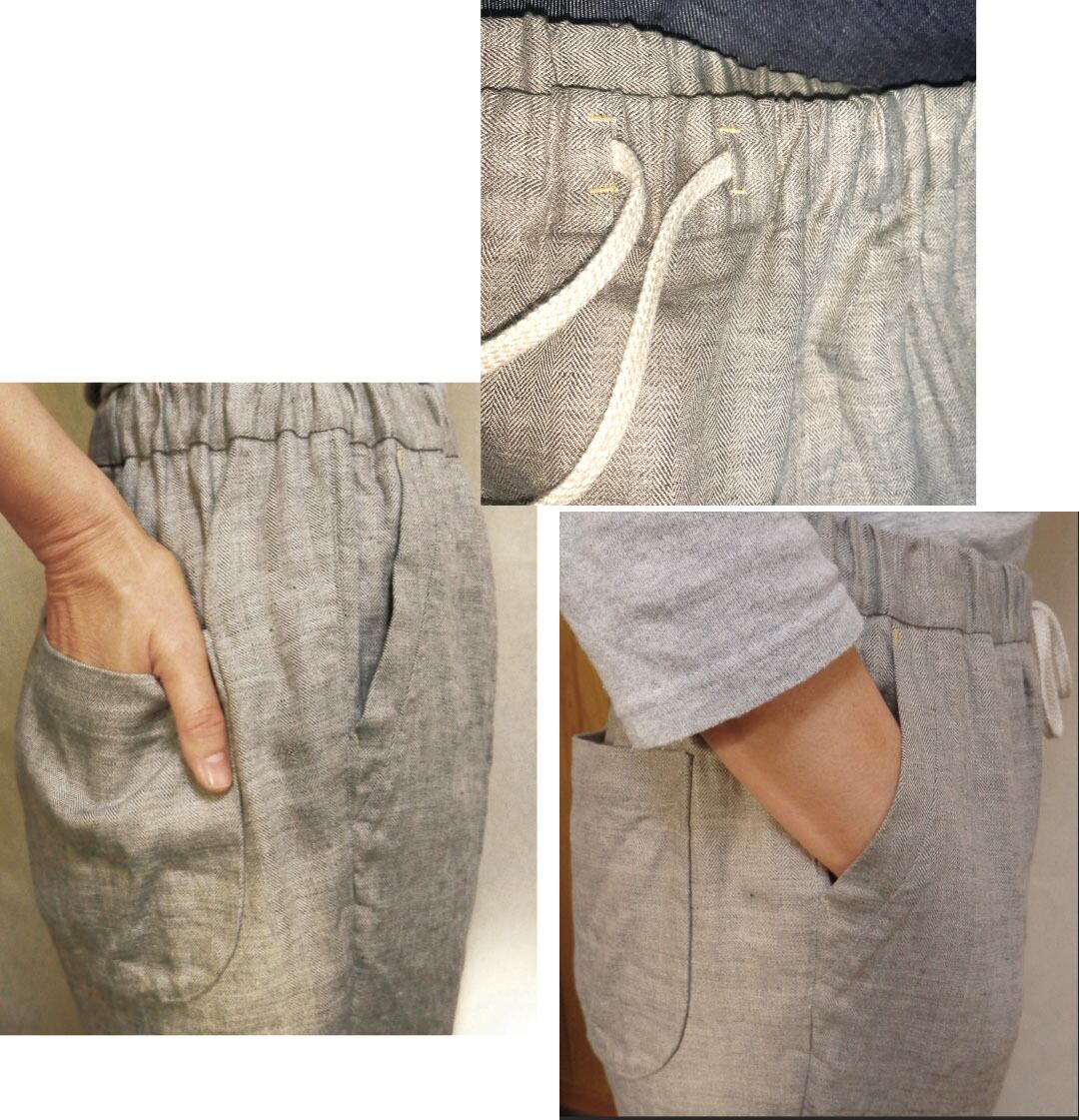 ・ウエストは共生地のベルトの中に35mm巾の平ゴムを入れ、あきなしでさっと履いていただけます。