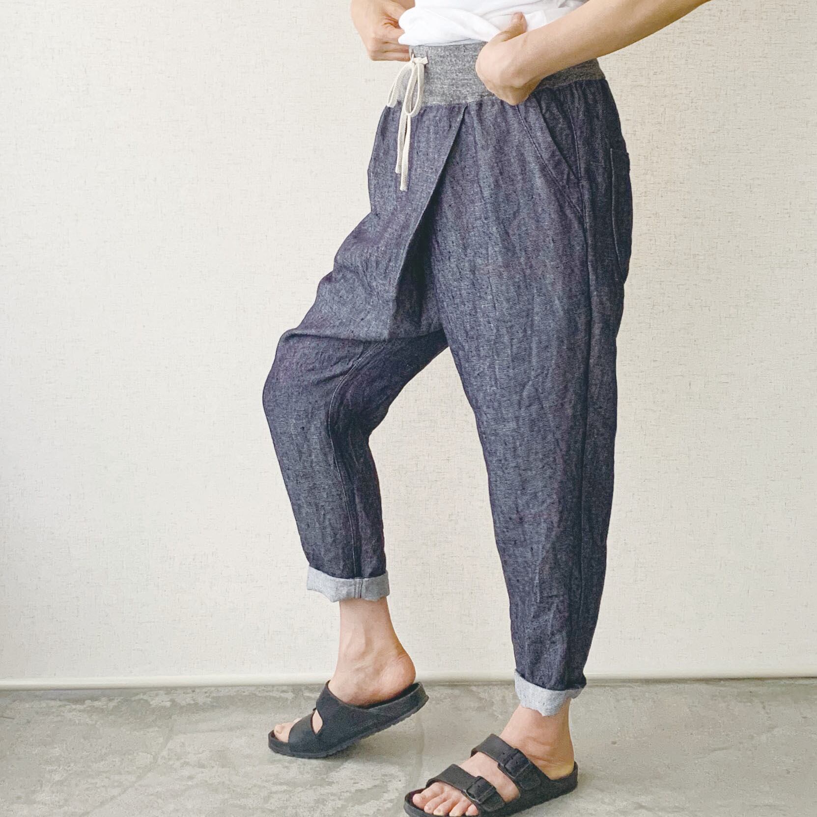 ・リネンデニムの張り感と適度なドレープ性を生かした、片側深めタックの裾すぼまりのパンツ。