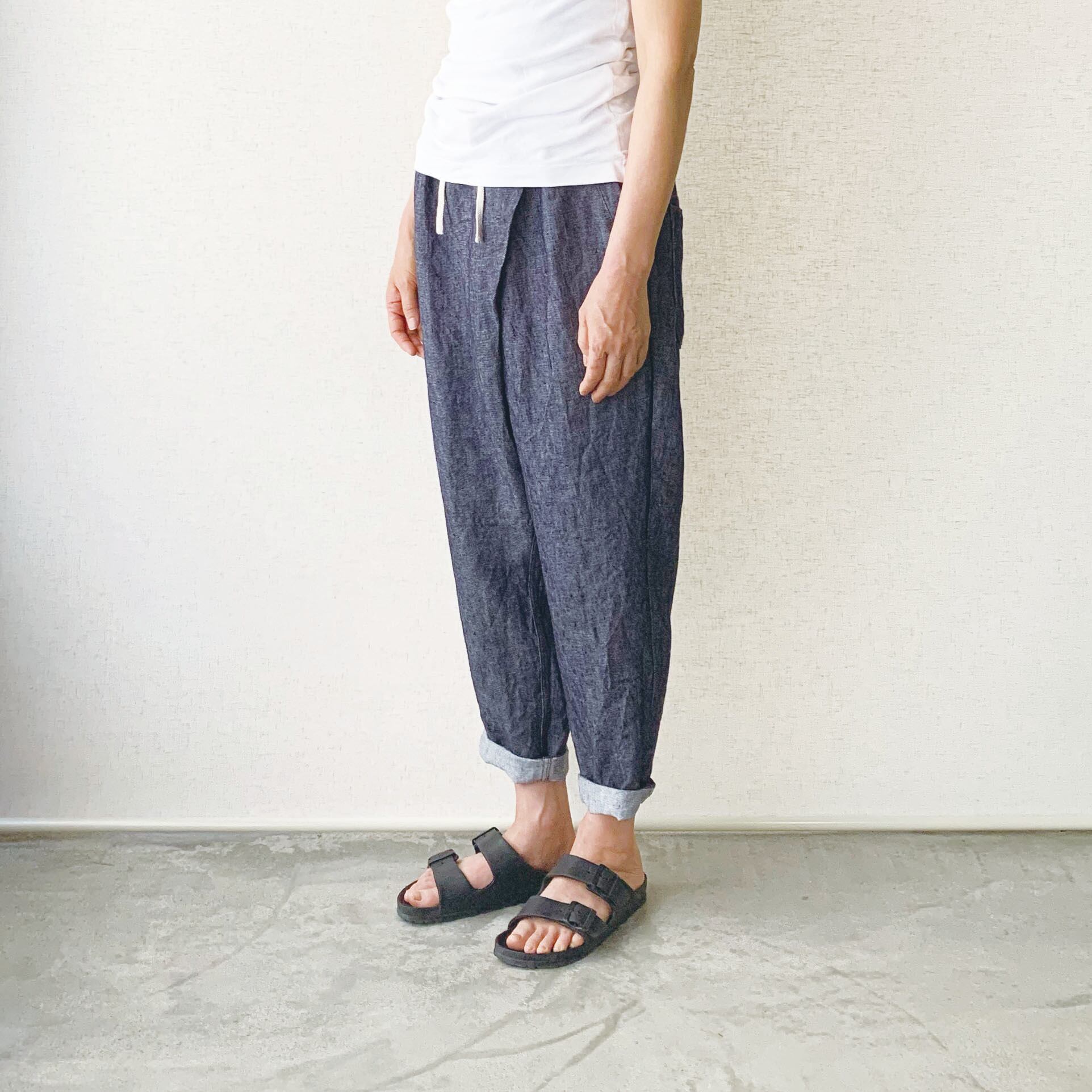 リネンデニム ウエストリブテーパードパンツ