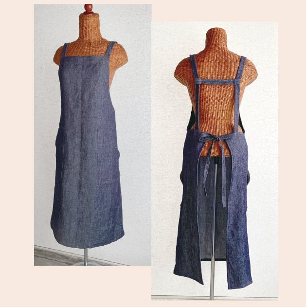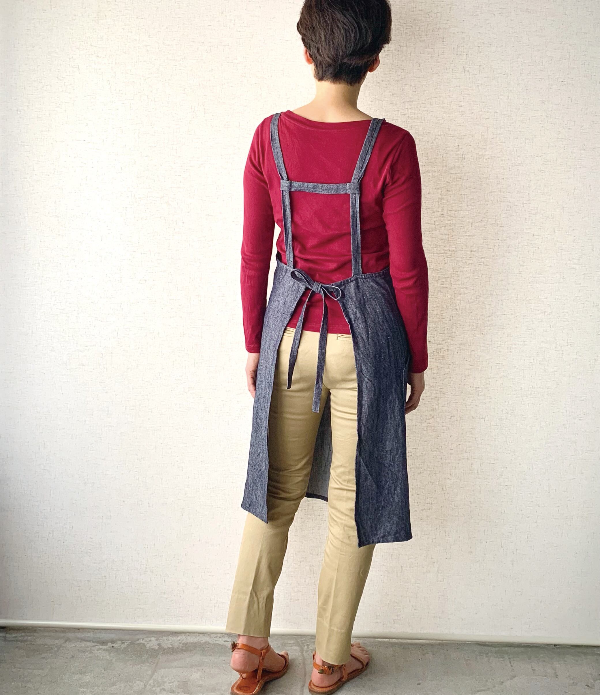 ・リネンデニム素材を生かした膝下丈のエプロン。