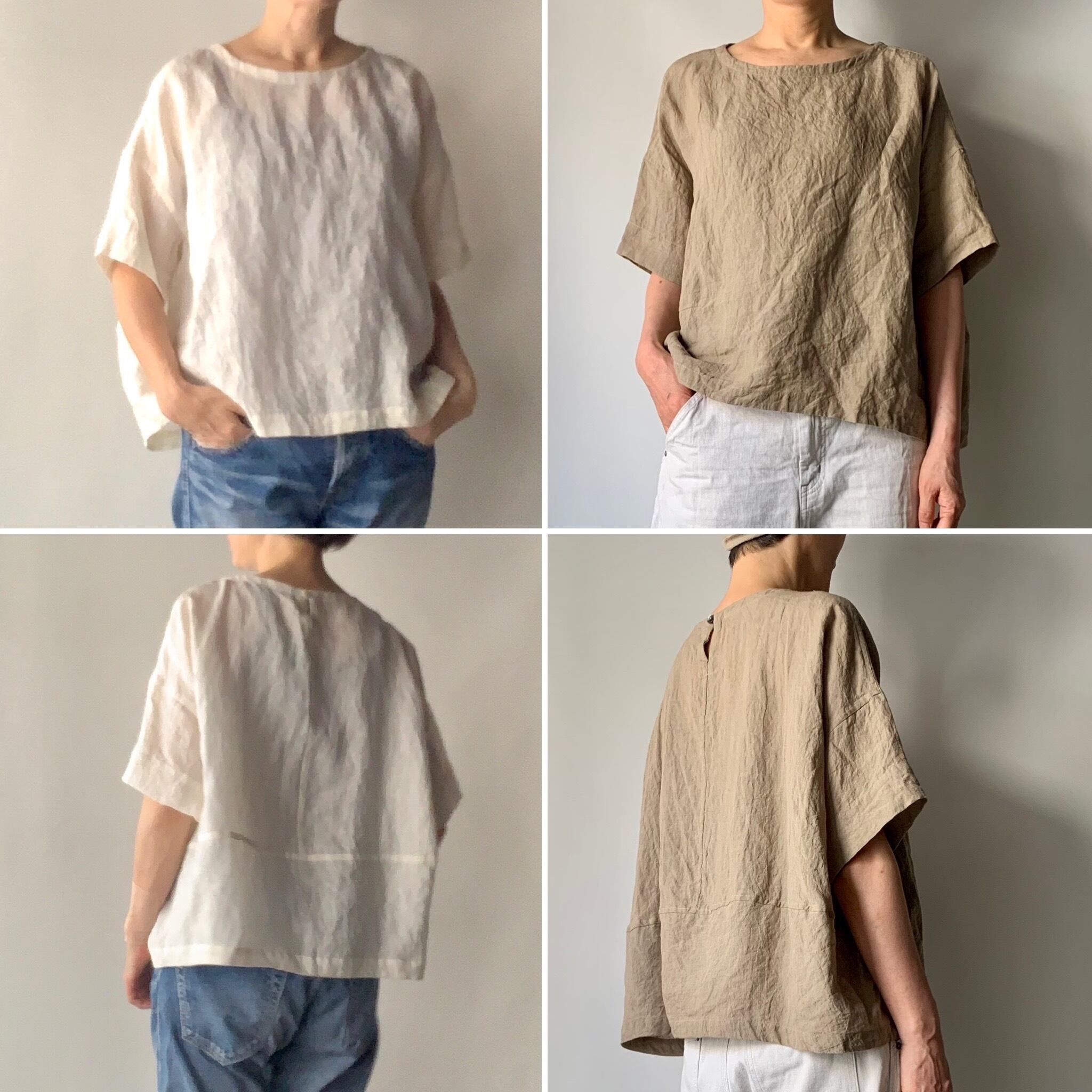 ・肘くらいまでの半袖、袖口は深めの縫い代にしているので、ひと折りして丈感の変化も楽しめます。