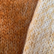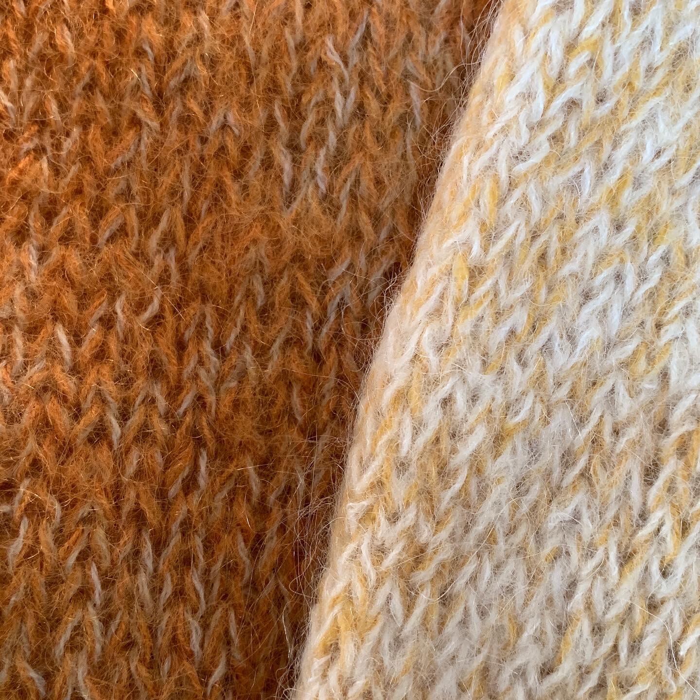 背中の濃い色の糸:オレンジ色のモヘヤウールと薄グレーの細番手のメリノウールを撚糸