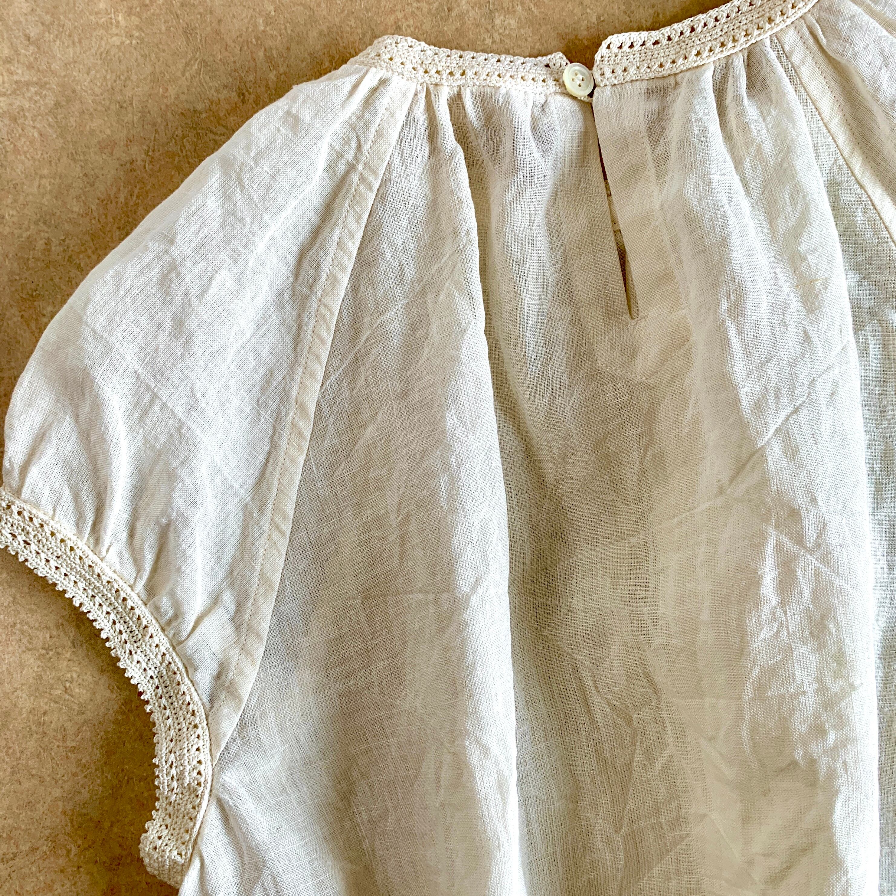 ・衿ぐりと袖口はパイピング仕立て、その上にクロシェレースをのせて手付け。