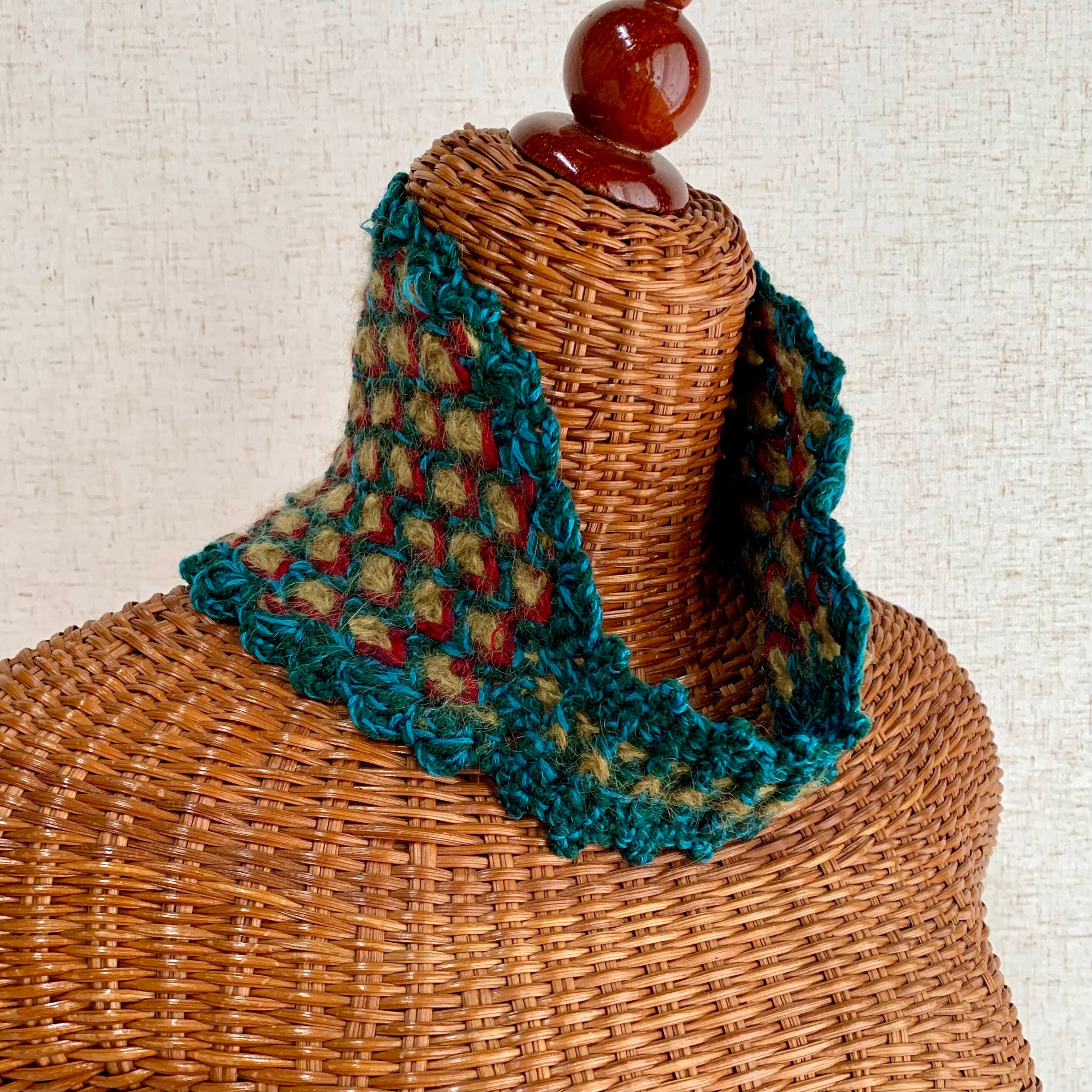 ・それぞれ撚り合わせた3色の毛糸でひし形状の模様に編み上げています。