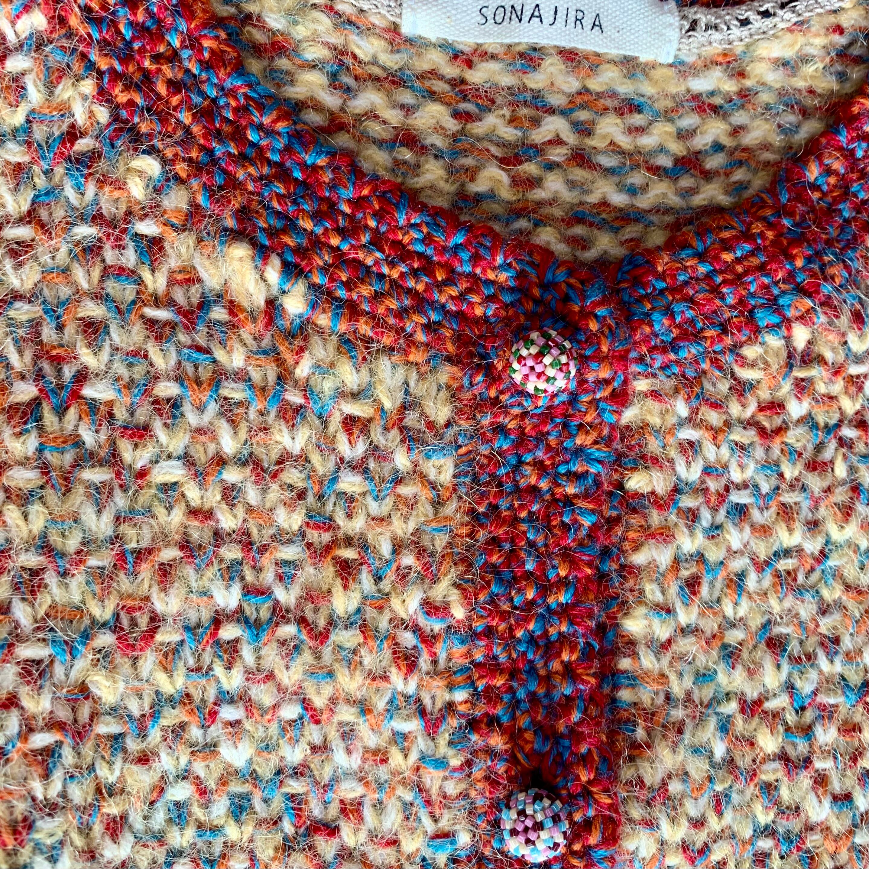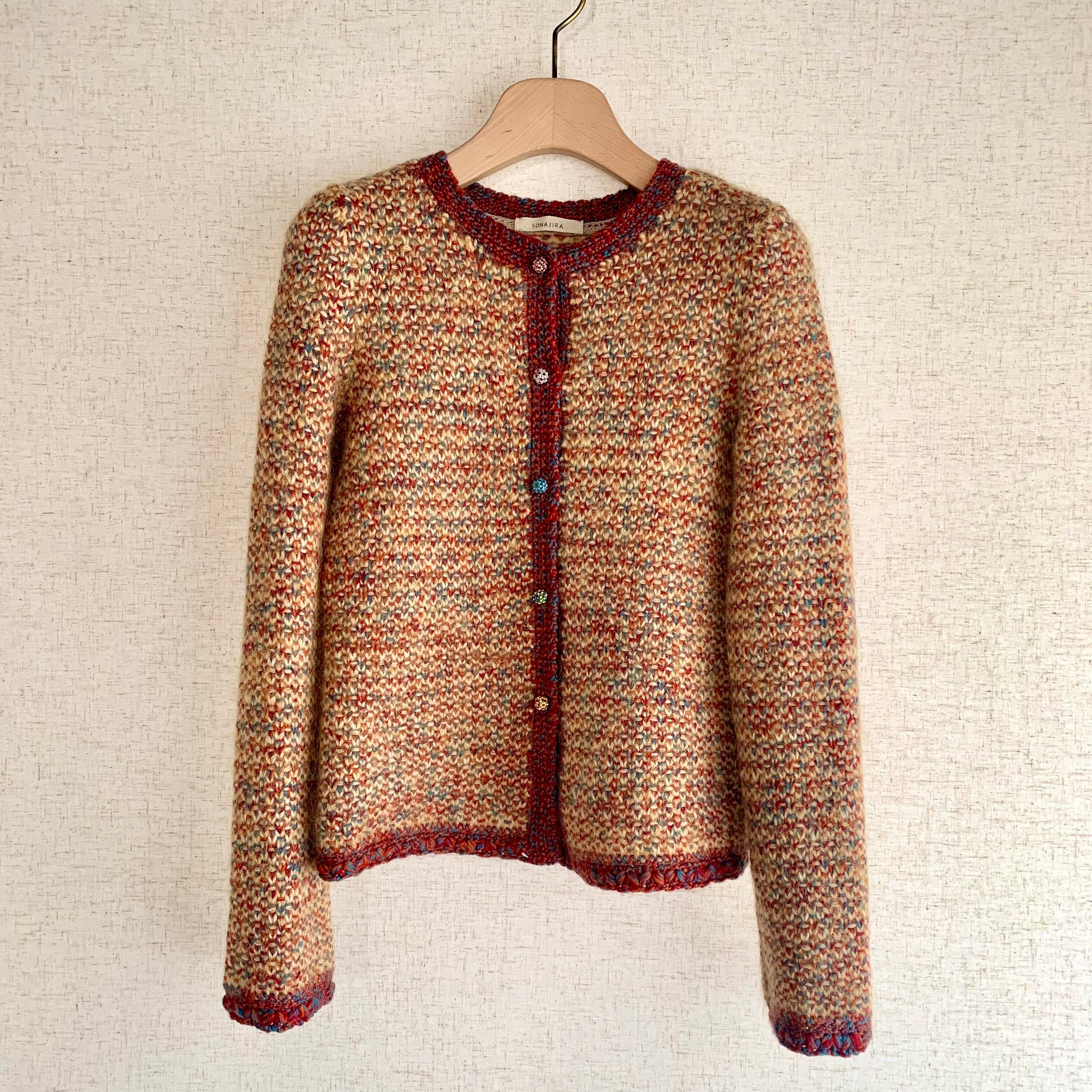 淡いイエローのモヘヤ混の糸とオフ白のラムウールの撚り合わせと、3色ミックスしたのメリノウールで優しいカラフルなツイーディ手編みニットカーディガンです。