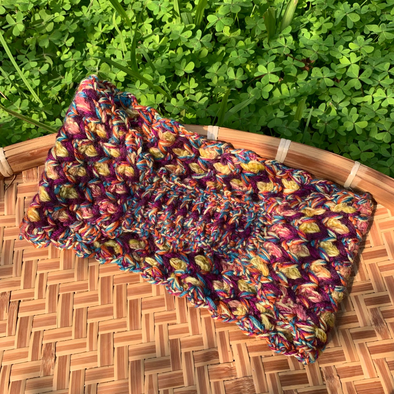 パープルとイエローは反対色でハードルの高い組み合わせなのですが、ムラ染のピンクイエローが緩和してくれて、そこにマルチカラーに撚糸した糸も合わせたら、スーッと優しく調和してくれました。