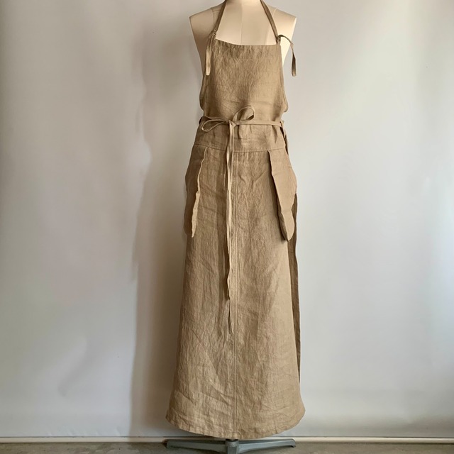リネン100% 肩ひも2⁻wayのロング丈のサロペットドレスです。 腰のあたりで低めにカッコよく結んでもいいし、ワイドパンツに重ね着もカッコ良い。 ウエスト位置で結んですっきり自然なXラインも素敵です。 ひざもカバーしてくれるので、冬は重ね着で温かく過ごせます。 夏場は首掛けをはずして前に垂らせば、スカートに。 年間通して着られる、が実現するアイテムです。 【デザイン】 ・リネンツイル素材を生かしたロング丈ラップ式サロペットドレス。 ・首にかける場合は、ひも1本で完結、胸当ての右と左の二重リングにその紐を 通すだけ。 リングに通すのが若干面倒ですが、この取り外しによって2通りの着方が可能になる デザインです。 ・背中でクロスする場合は、2本のひもを胸当てのリングと後ろウエストのリングに クロスさせて通します。あらかじめ通しておいてから着ると楽に着られます。 後ろウエストを固定にしておいて、着てから胸当てのリング側で長さ調整してみて ください。 ・ポケットは周囲を浮かしたデザインでベタっと張り付かないので、腰回りの身体のラインを 拾わず、カバーしてくれます。 ・着るときは、後ろでラップするのですが、左手に持ったウエスト端のひもを、右脇の 玉縁ホールに通します。右手に持った端は左後ろに外側から回して前に持ってきて 前中心で結びます。(言葉だけだとムズムズしますね) 不明点はお気軽にお問合せください。 【色】 ベージュ 落ち着いた色味のベージュで、濃色(ネイビーや黒、茶)との組み合わせも好相性。 【素材】日本製 ・麻100% リネンツイル(綾織り)中肉 張り感と適度なとろみ感あり *生地は天日干し乾燥されたものを使用しており、かみなりジワなどが見られます。 この素材特有のものとして お楽しみいただけると幸いです。 ・別布(バインダー部分):麻100% ・リング:鉄 色:アンティークゴールド 【サイズ】 ・着丈: 約130〜135㎝(肩紐で調整可能) ・本体胸当て上辺から裾まで:約116㎝ ・ウエストから裾まで:後ろ中心で 約93㎝ ・ウエスト:約75~85㎝対応(ラップ式で調整可能) ・ヒップ:約90~100㎝対応(ラップ式で調整可能) 【お手入れ方法】 ・手洗い、中性洗剤使用 洗濯表示には手洗いにしていますが、洗濯ネットに入れて弱水流やソフトコースで洗濯機でも洗っていただけます。 ・色移りを防ぐため、単独洗いをし、長時間濡れたままの放置は避けてください。・漂白剤、乾燥機は避けて下さい。 ・脱水は軽めにし、脱水後はしわを伸ばし形を整えて すみやかに風通しの良い場所に吊り干ししてください。 *縫い目(脇、裾、前中心、ひもなど)を軽くパンパンと引っ張ってから干してあげると、 すっきり乾きあがります。 ・アイロン基本的には不要ですが、気になる場合はかるく形を整える程度にかけてください。 ・リングは鉄製ですので、さびを防ぐために水に付け置きは避けていただき、脱水後は すみやかに干してください。 ※その他、ご質問等ございましたら、お気軽にお尋ねください。